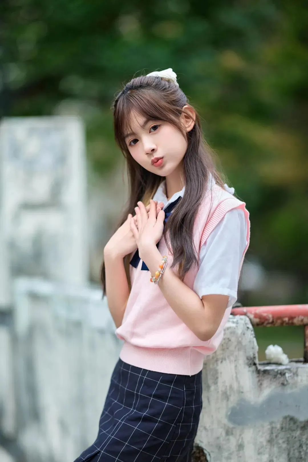 倚靠在石栏上,一手扶额,一手抱书,再配上甜美的笑容,搭配清新的学院风穿搭,整体姿态随性又俏皮。照片洋溢着青春活力,这个姿势非常适合展现校园生活轻松美好的一面。