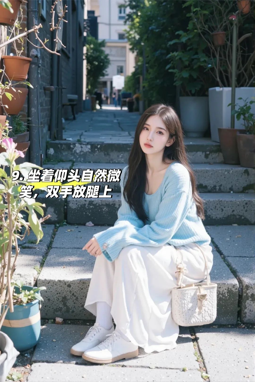 找个合适的地方坐下,比如路边的台阶、街边的马路牙子。双手随意地放在腿上,微微仰头看向镜头微笑,拍出来的照片随性又清新,满满的生活气息。将街头独有的自在与洒脱完美呈现,这个姿势既不呆板也不刻意,端庄又大方。