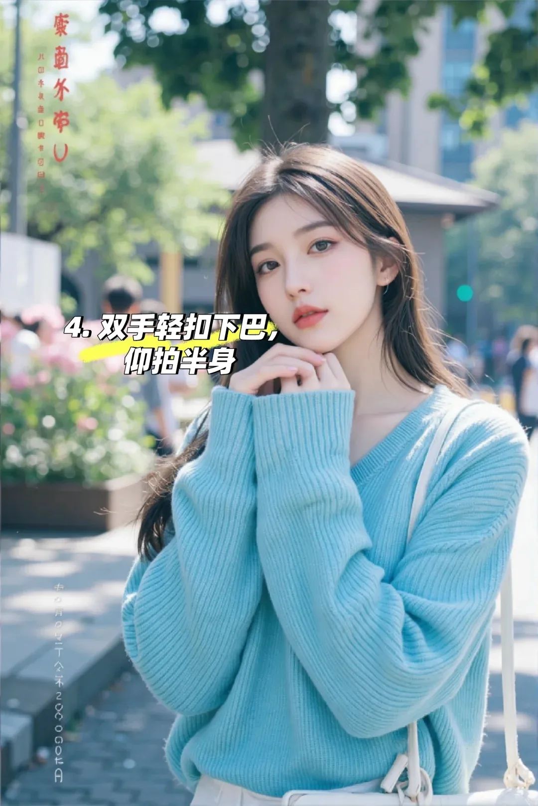 双手轻轻叩放在下巴处,采用仰拍的视角拍摄半身照。这个姿势超有范儿,双手轻叩下巴的动作,给人一种俏皮又带着思考感的氛围,灵动十足。而且仰拍还能在一定程度上拉长颈部线条,让你看起来更加显瘦。