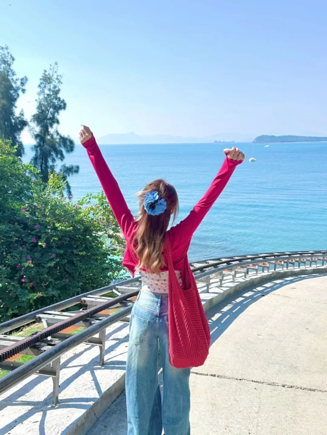 不想露脸?拍背影同样精彩。站在海边,双手高高举起,伸个懒腰,尽情享受大海的风和阳光。红色上衣与宽松牛仔裤的搭配,再加上简单自然的发型,增添了几分随意与惬意。从背后拍摄全身,人物与背景形成完美呼应,展现出蓬勃的生命力。