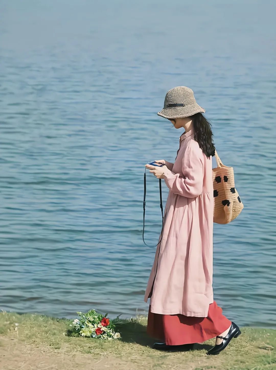 穿着长裙,戴着编织帽,站在湖边轻轻低头,凝视手中的相机。这个姿势凸显出温柔与文艺感,同时避免正脸入镜,让画面更具故事性。利用微风让裙摆和头发自然飘动,增加画面的灵动感,营造出法式浪漫氛围。