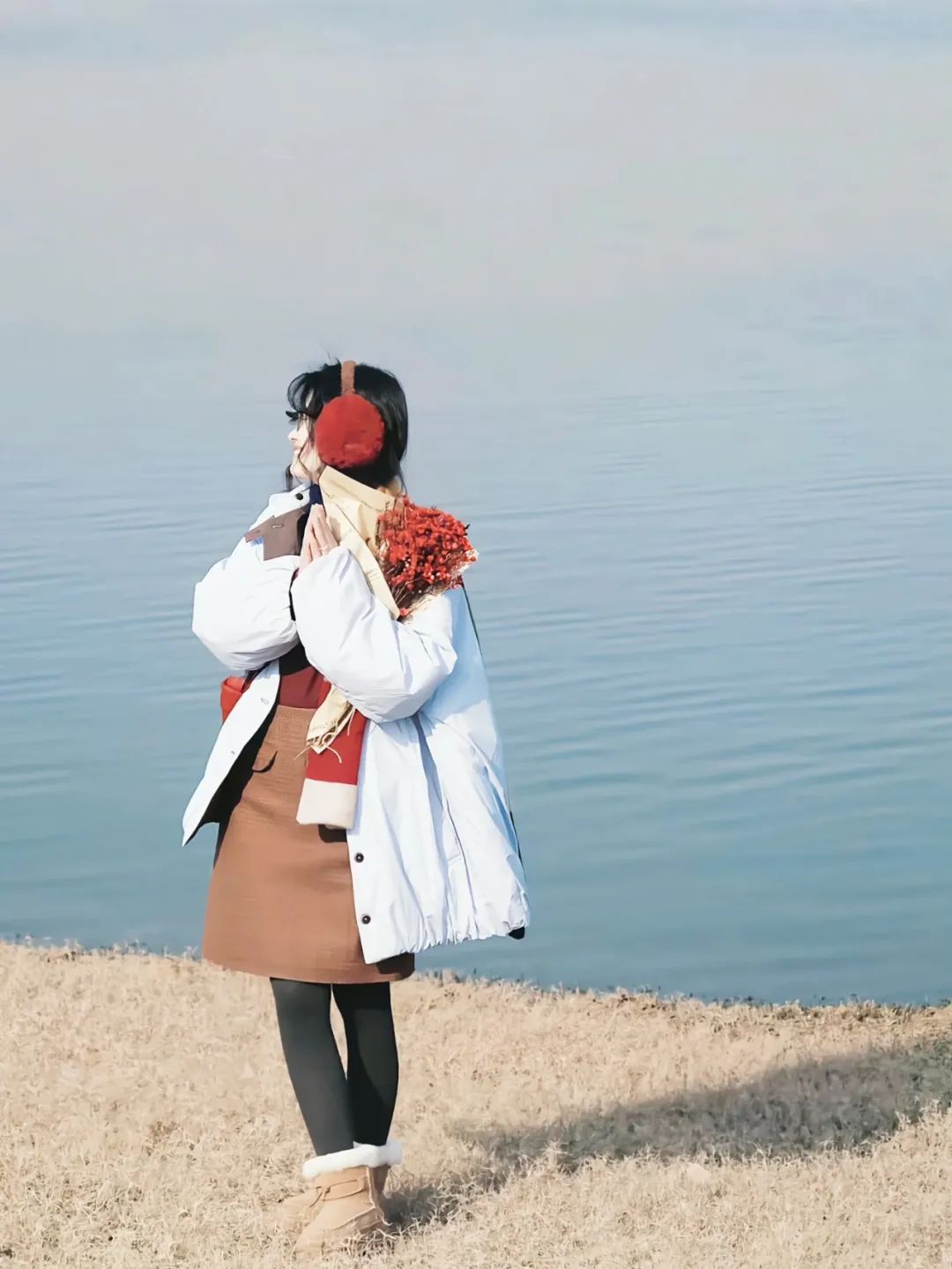 冬日拍照,双手捧着红色花束,站在湖边微微侧身,仿佛沉浸在冬日的暖阳中。这个姿势不仅展现出冬季的温柔感,还通过冷暖色调的对比(蓝色湖面+暖色服饰)来增强画面氛围。