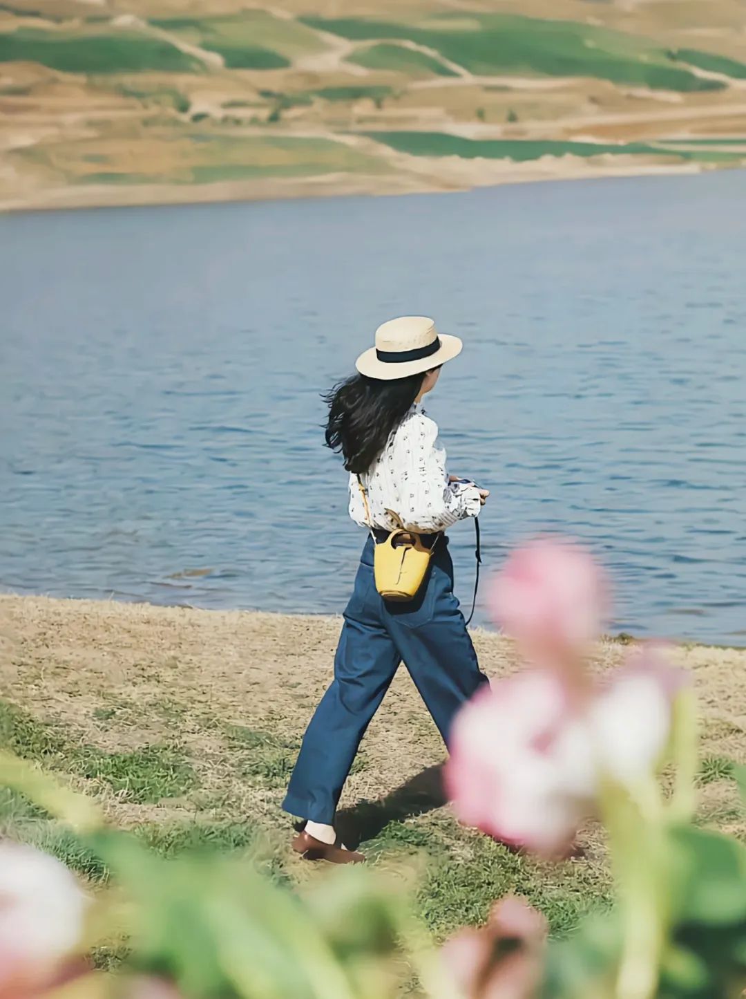 在湖边漫步,背对镜头,微风吹起长发,肩上斜挎小包,手中紧握相机,悠然自得。拍摄时在镜头前加入模糊的花草作为前景,增加画面层次感,让照片更显唯美梦幻,同时避免直接露脸,增强氛围感。
