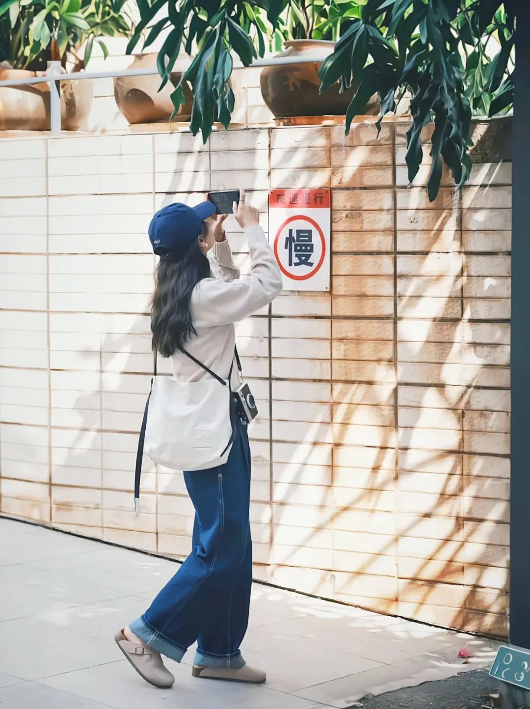 站在光影斑驳的墙前,手持相机向上取景,帽檐遮住脸庞,自然流露出专注的神情。背景的“慢”字与悠闲氛围相得益彰,随手一拍便是文艺大片。略带生活感的偷拍视角,营造出电影般的画面感,关键在于松弛自然,仿佛自己就是日剧女主角。
