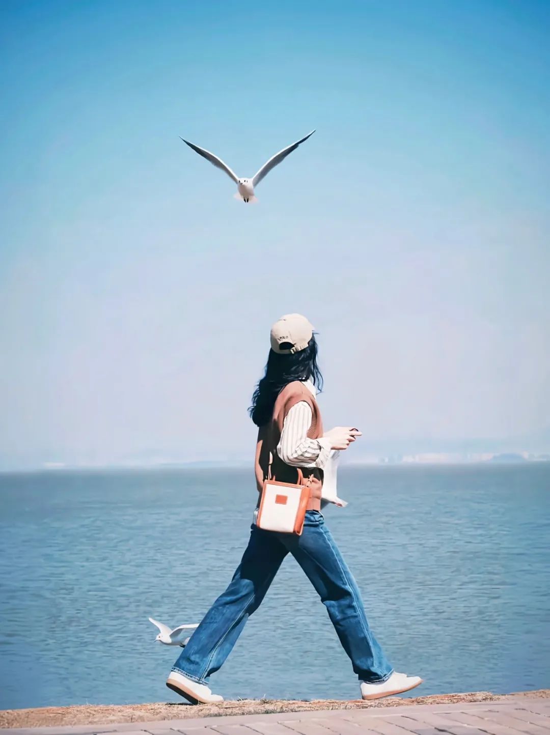 不露脸拍照,动态抓拍更胜一筹。在海边,侧身自然迈步前行,利用帽子、包包等道具点缀,抓住海鸥翱翔的瞬间,快门连按,多层次氛围感交织,故事感油然而生。