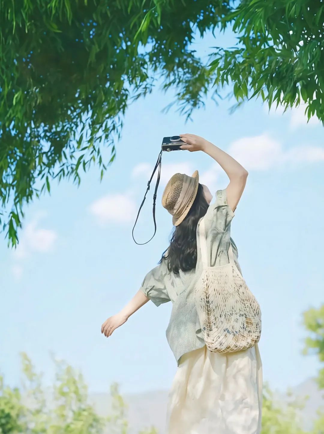站在草地上,单手高举相机,另一只手微微摆动,微风中帽子或包包随风摇曳,为画面增添动感。这个姿势特别适合蓝天与绿树的背景,低角度仰拍让身形更加修长,自然光线让画面呈现出梦幻般的清新气息。