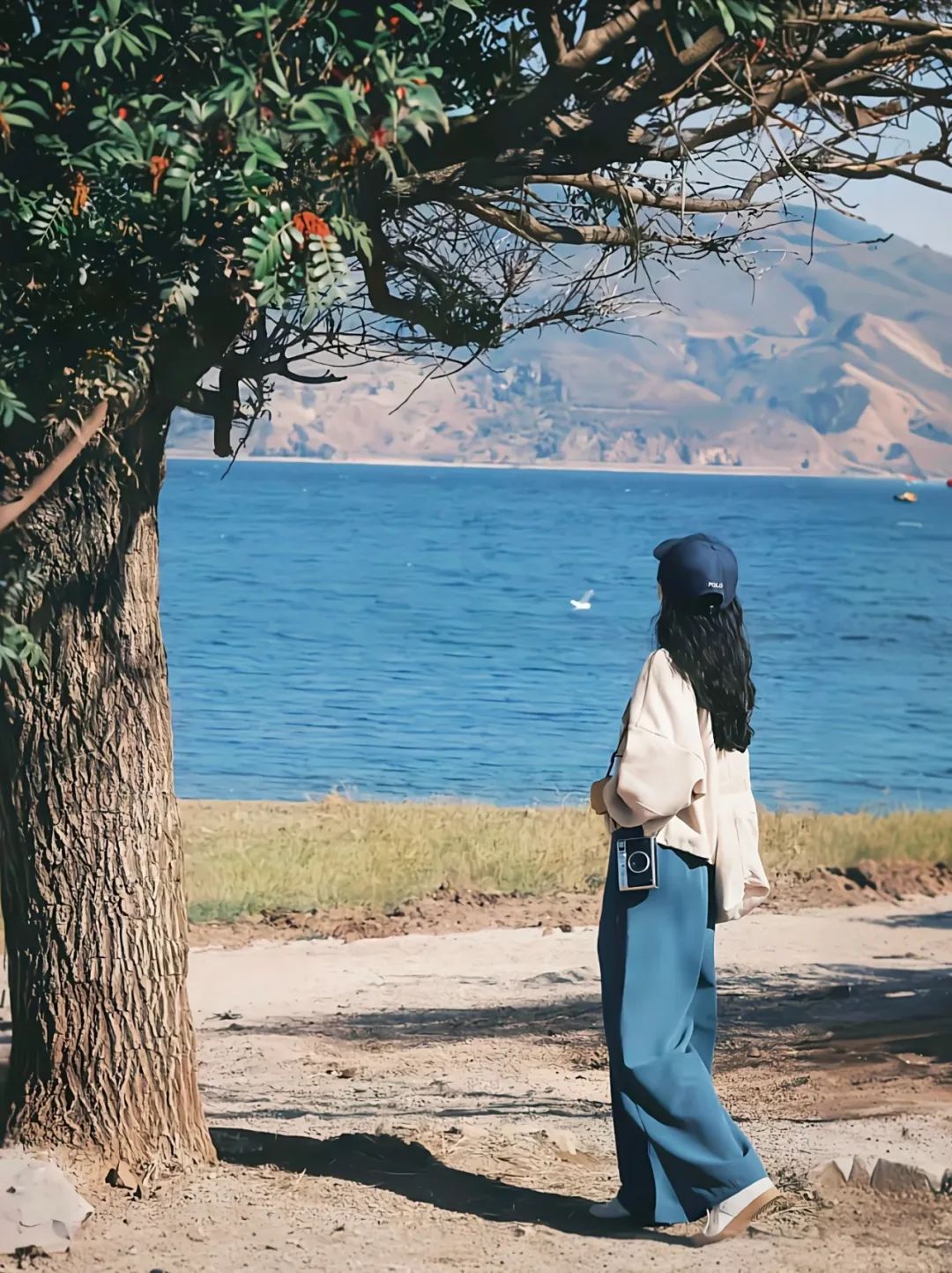 站在树边,微微侧身,远眺波光粼粼的水面。挎上包包或相机,戴上帽子,道具的点缀让画面更具层次感。侧身远眺的姿势,让画面充满故事感与深度,慵懒随性中透露出文艺胶片感,意境悠远。