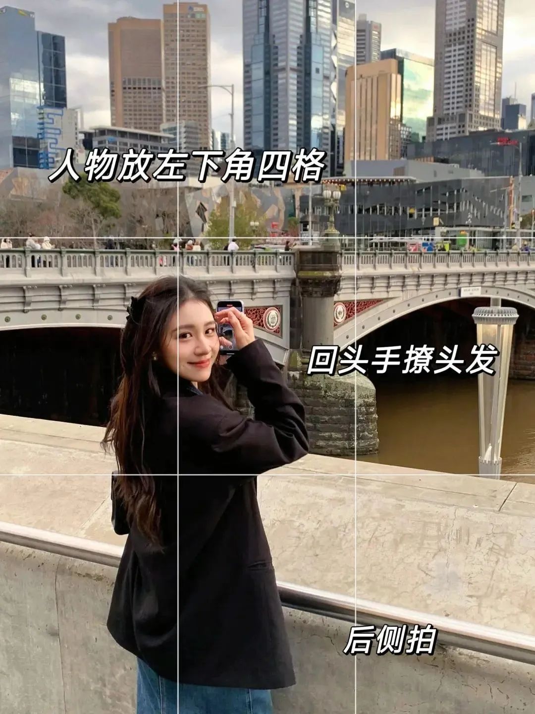 找个有栏杆的地方站好,让自己站在画面的右下角四格位置。然后摆个抱手倾斜靠栏杆、偏头看向远方微笑的姿势。这个姿势简单又出片,大家不妨试试看!