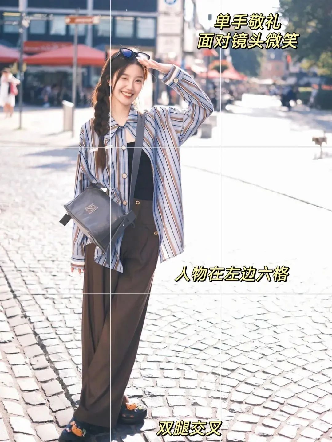 拍站姿照时,可以站在画面的左边六格位置,双脚交叉站立,抬起一只手敬礼,微笑着面对镜头。这个姿势自然又漂亮,出片效果杠杠的!