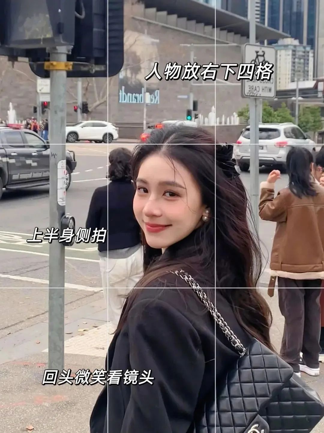 在外拍照时,可以站在画面构图的右下四格位置,摆个上半身侧拍的姿势,再配合一个回头微笑看镜头的动作。这样拍出来的照片姿势特别美,大家赶紧学起来!