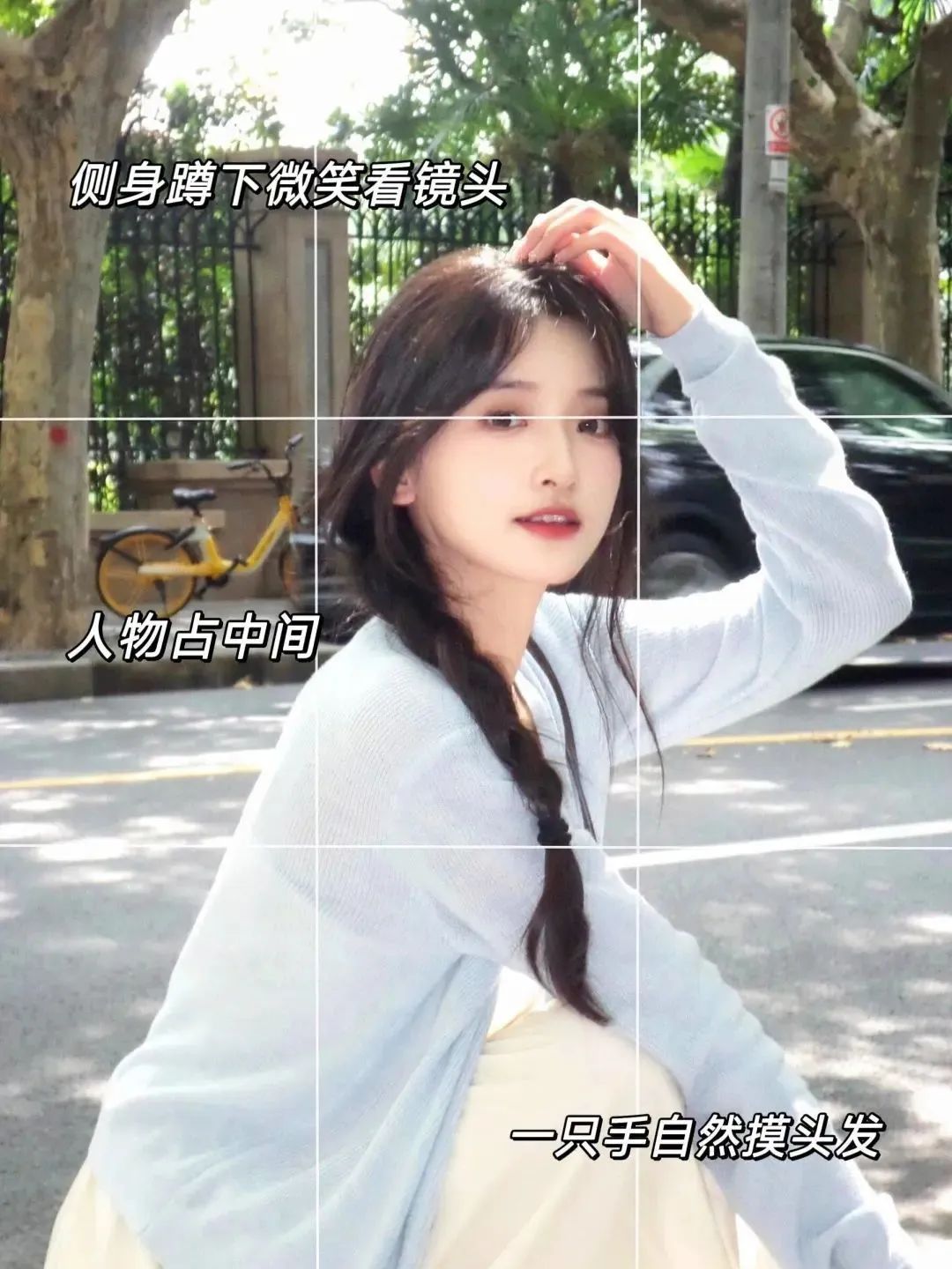 拍照时,可以侧蹲下来摆拍,让自己站在构图画面的中间位置。微笑着看向镜头,一只手抬起来自然地摸头发。这样拍出来的侧蹲照特别出片好看!