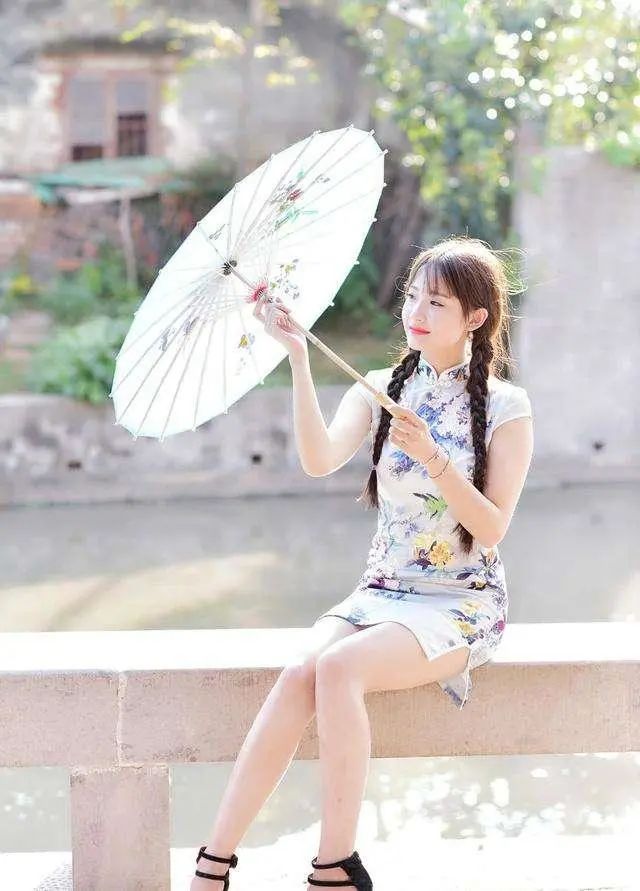 在春天的小河边,我们可以这样拍照。穿一双黑色的鞋子搭配上一身青花色的旗袍,给人青春靓丽而又时尚的感觉。坐在小河边的栏杆上,身体稍微侧向右边。右手撑着雨伞的顶部,左手握住雨伞的伞柄。眼睛自然地看像雨伞的位置。