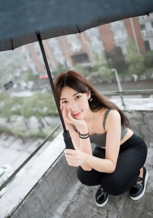 雨后的春天一切都焕然一新的感觉,如果没有时间去大自然里感受这种清新的空气,我们也可以在房顶上拍照。像这张照片一样,美女蹲在房顶上,左手撑着一把黑色雨伞,右手放在膝盖上。用手掌撑着自己的下巴,眼睛看向镜头拍照就可以了。