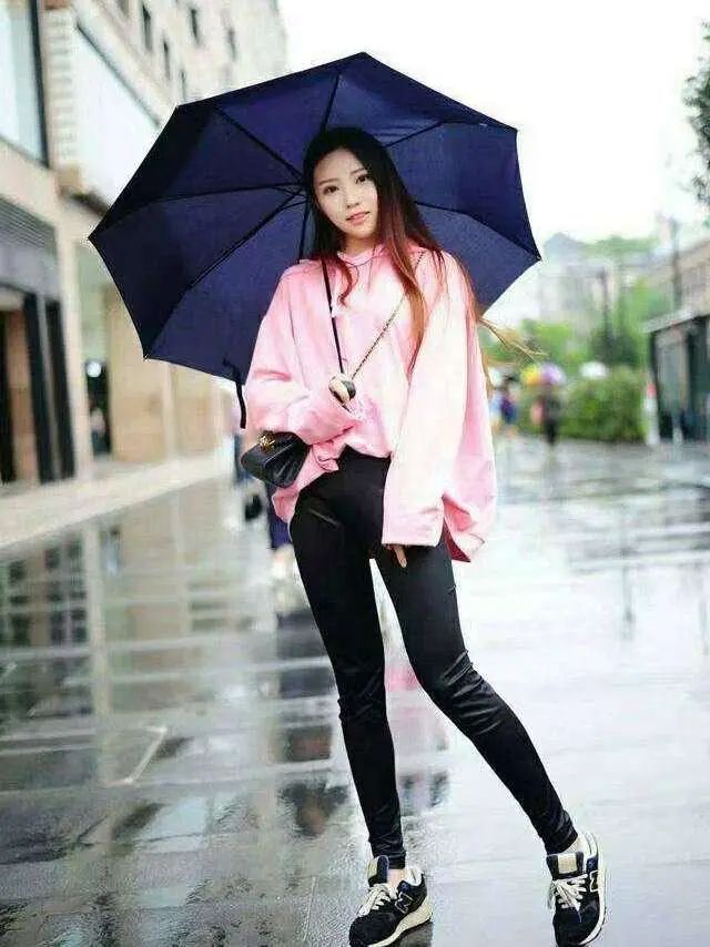 春天下起雨的时候,外面的风景更加别具一格。世界都像被清洗了一遍,给人非常清爽的感觉。走在大街上撑一把雨伞,我们可以这样拍照。一条黑色的紧身裤,搭配上粉红色的上衣,简约而又时尚。右手将雨伞撑在身后。
