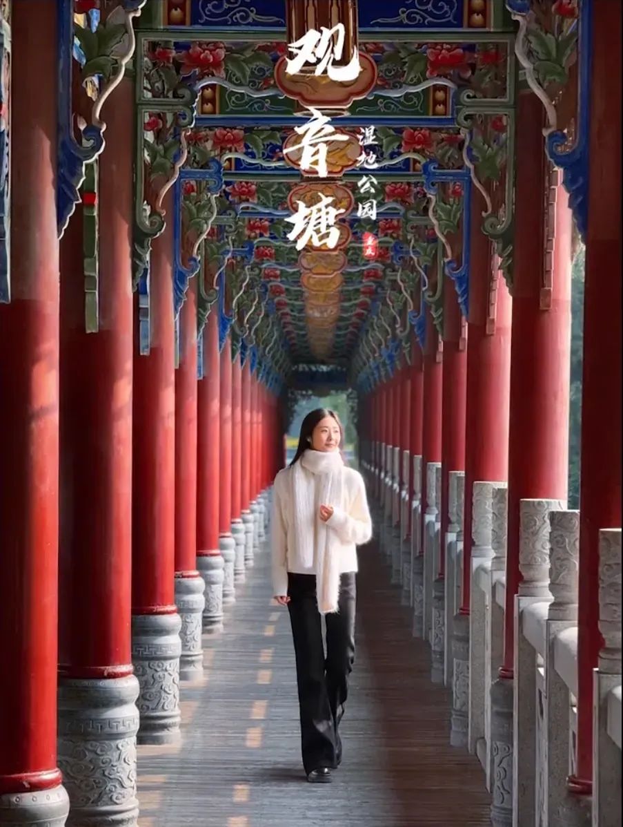 首先,不妨尝试站在长廊的中央,利用长焦镜头放大画面。这样,长廊的线条将向远处无限延伸,为照片增添出强烈的纵深感。你只需随意摆出一个自然的姿势,镜头前的你便能瞬间成为故事的主角,满满的故事感扑面而来。