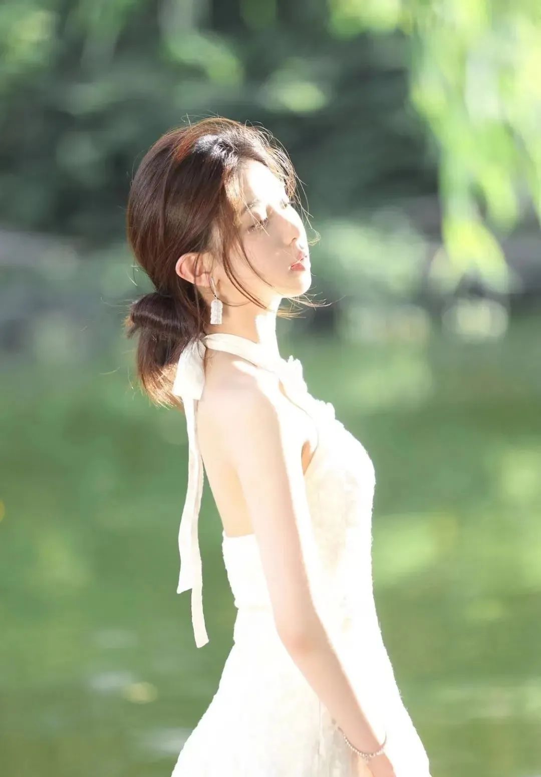 侧面拍摄能够很好地展现脸型和五官轮廓,捕捉到侧颜的美。在拍摄时,下巴保持约45度抬头,这样能让脸部线条更加流畅,搭配一些手部动作,增加人像的动感和情绪。