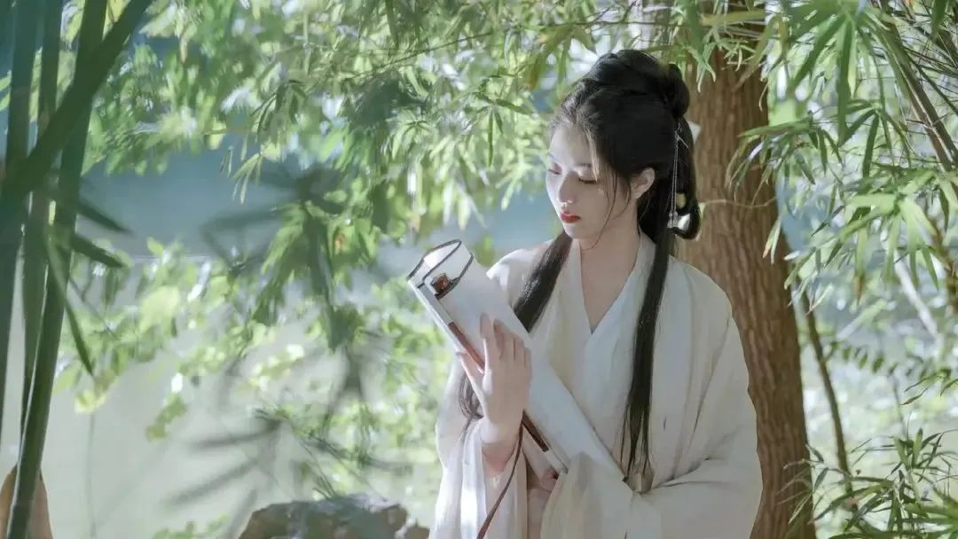 近景拍摄手法下,模特双手捧着一幅古韵盎然的画卷,与身着的古装相映成趣。背景中的竹子元素巧妙融入,为画面增添了一抹浓郁的中国风情。柔和的光线透过树叶的缝隙,从侧面洒落在模特的身上与脸庞之上,营造出一种宁静而唯美的氛围。整个画面以清新的绿色为主调,辅以自然的色彩点缀,展现出清新淡雅的艺术风格,让人仿佛置身于一幅动人的山水画卷之中。