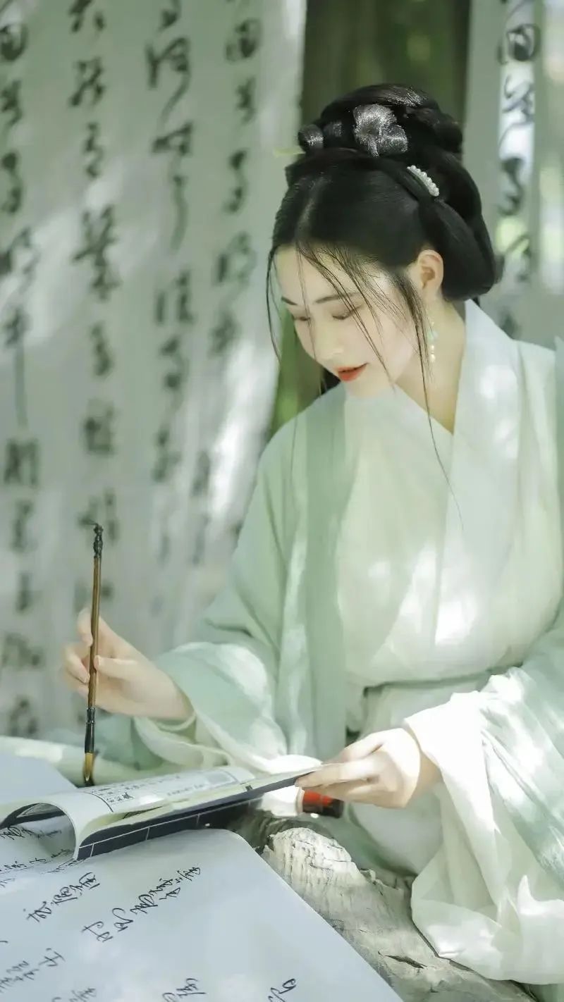 镜头聚焦于近景,长焦镜头将背景细腻虚化,凸显主体风采。桌上与背景中的手写文字,如同历史的印记,为画面增添了深厚的文化底蕴。模特左手轻执书卷,右手毛笔轻挥,书写着流传千年的汉字,每一个动作都透露出文人墨客的雅致。服饰、耳坠与淡雅的粉绿色发夹,每一处细节都彰显着匠心独运。侧前方柔和的光线,如同晨曦初照,映衬得模特肌肤白皙细腻,仿佛书香之气缭绕,营造出一种静谧而充满文化底蕴的氛围。