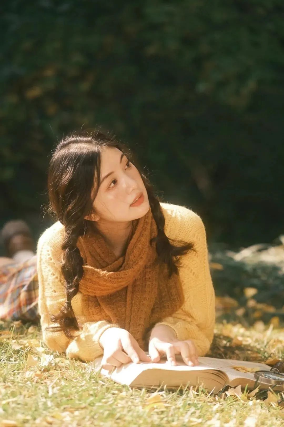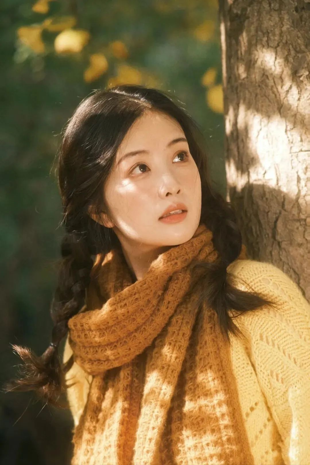 全景镜头中,她侧身而立,面容半隐,居于画面中央。棕黄与绿交织的色调,既赋予画面沉甸甸的质感,又不失浪漫与华美的气息,黄色的点缀更为其增添一抹明快。侧前光斑驳地洒落在她的脸庞与身躯,凸显其在画面中的核心地位。她双脚交叉,轻轻倚靠在一棵银杏树旁,双手持一片落叶于胸前,脸庞微侧,向一侧投去探寻的目光。围脖与木编箱为这场景增添了几分复古与温馨的氛围,宛如一位温婉的民国女学生。