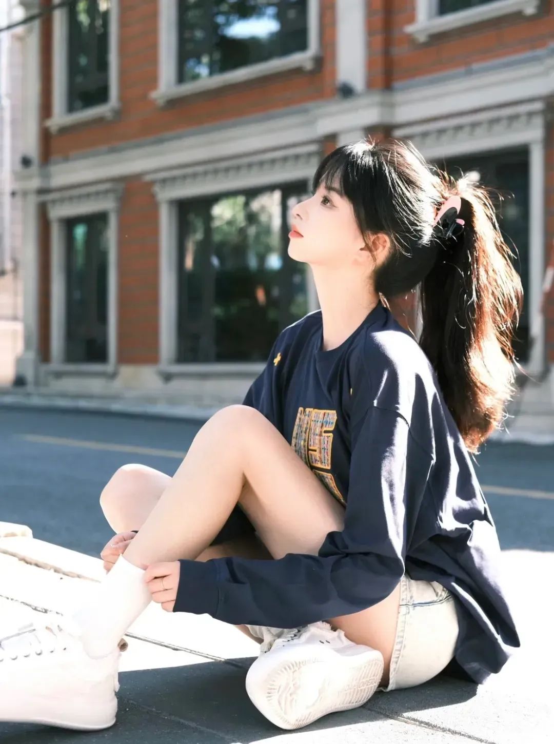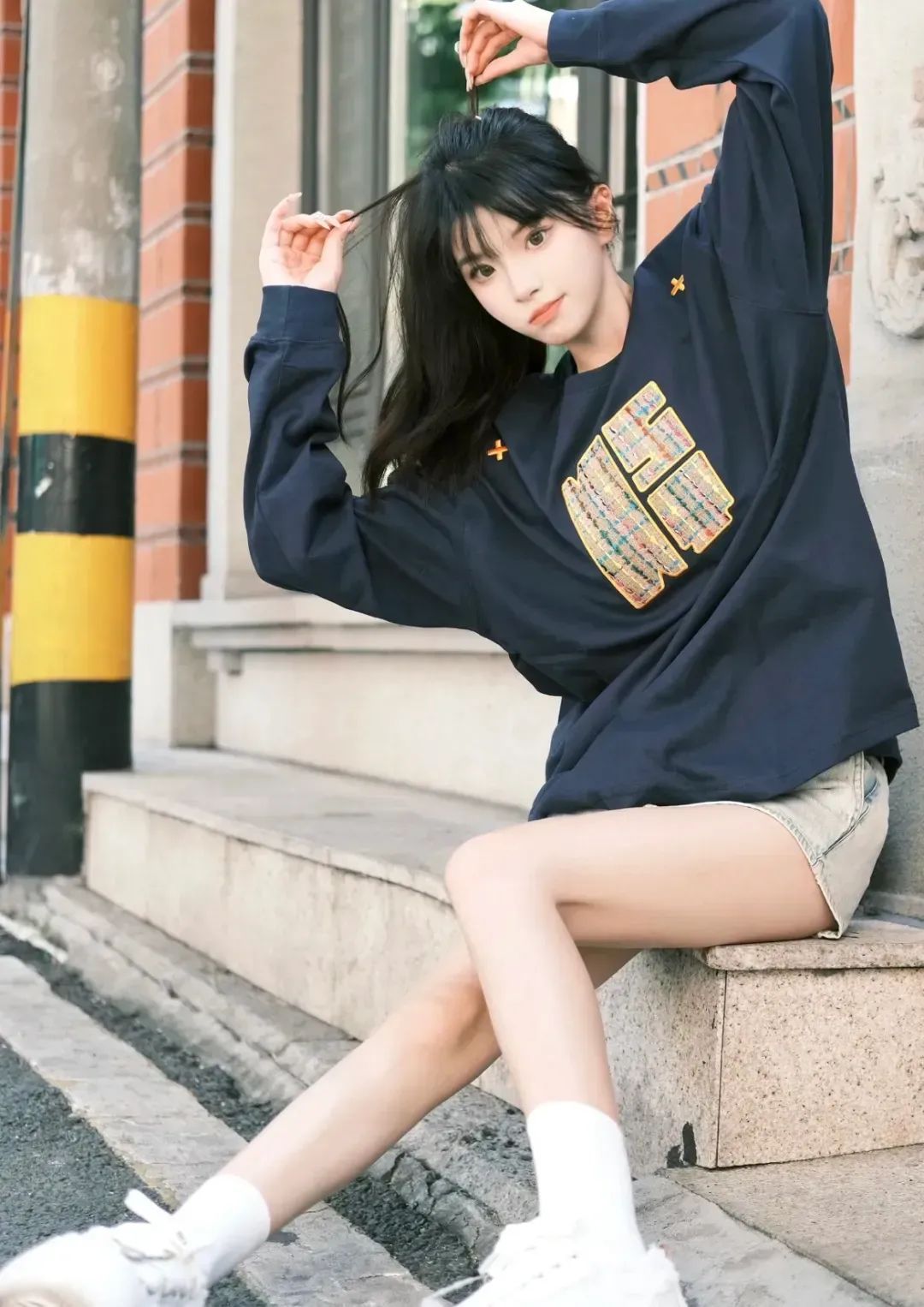 坐在台阶上,双腿一伸一曲,巧妙利用高度差构建视觉层次,搭配随意抚发的动作,让每一张照片都充满故事感与趣味性。