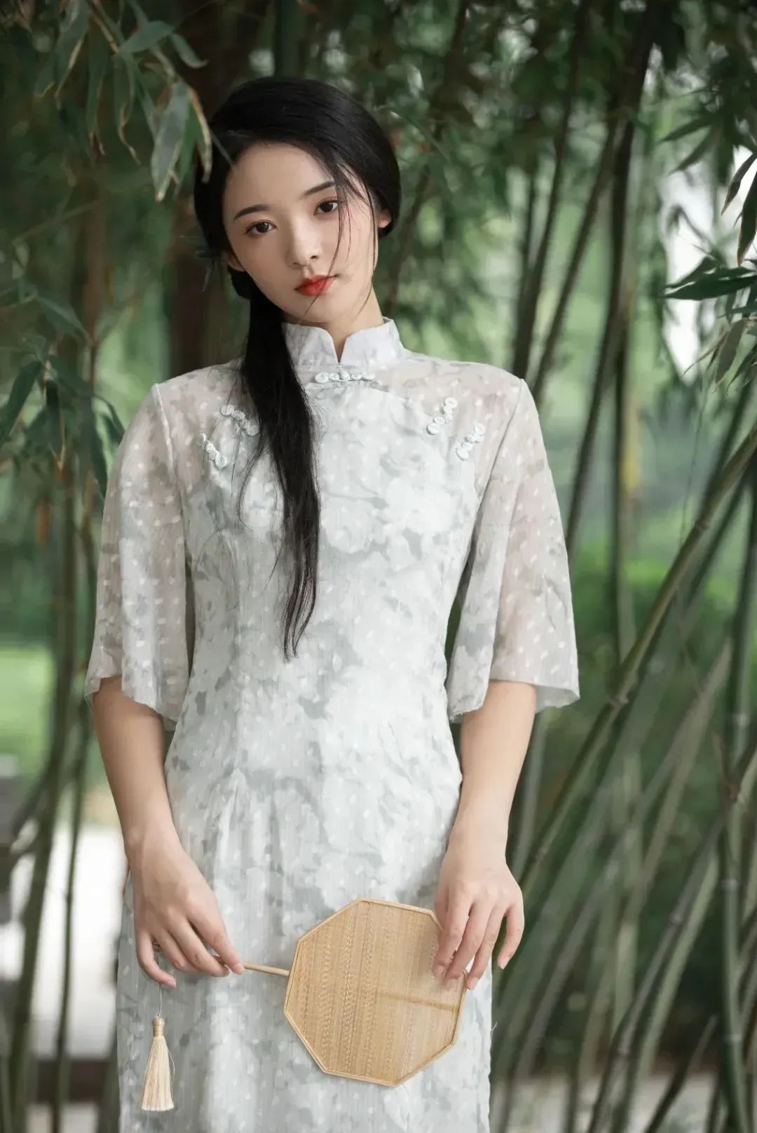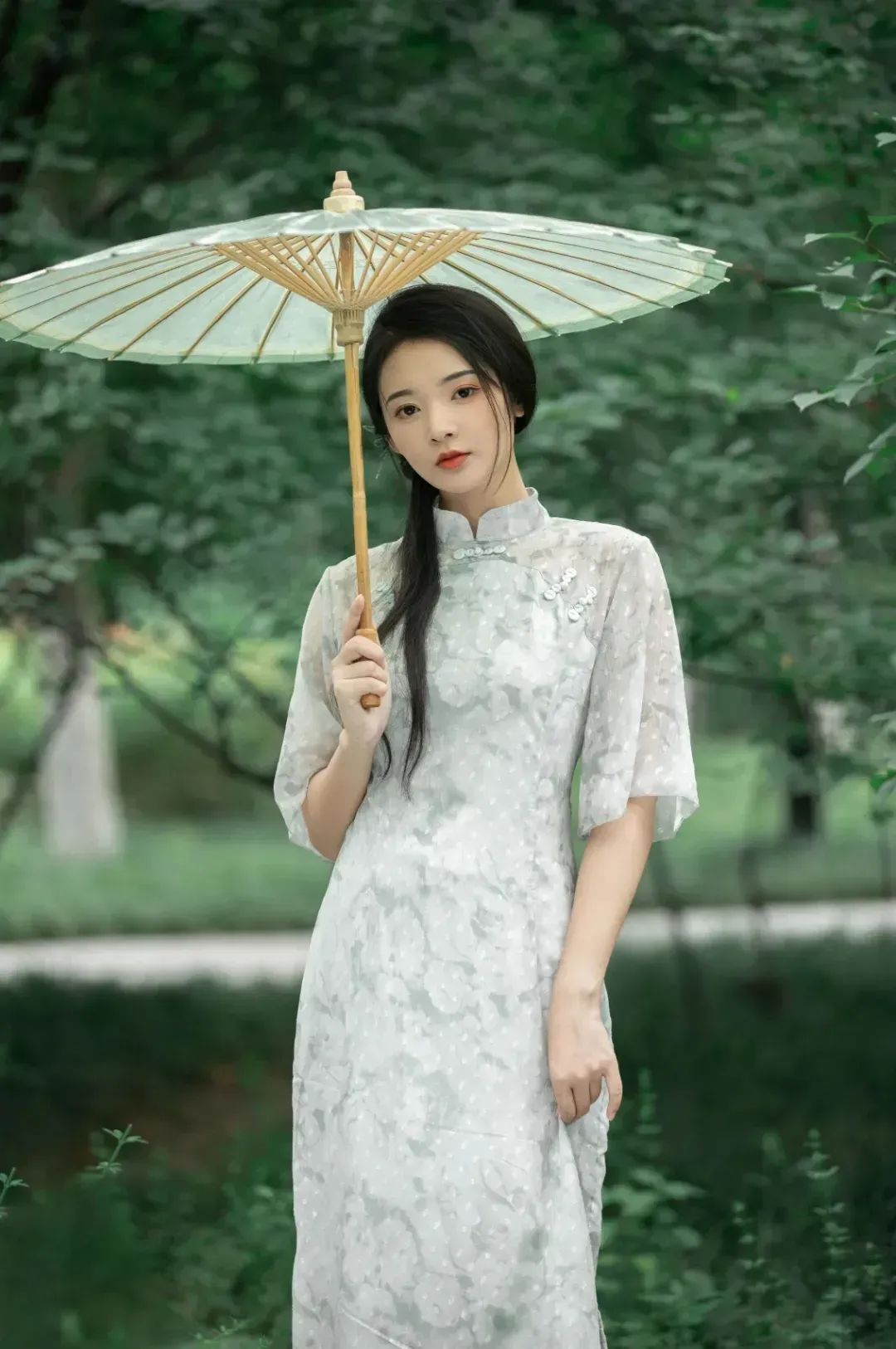 双手轻握一柄竹伞,微垂眼帘,流露出淡淡的含蓄与雅致。于绿意盎然的公园小径,这画面仿佛一幅古典水墨,温婉而深邃。