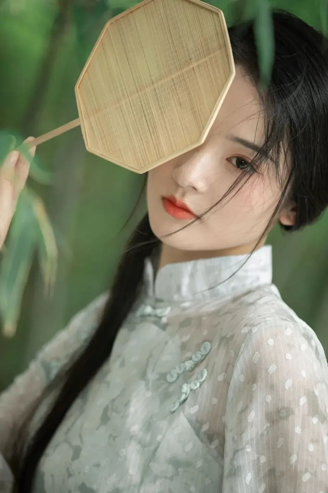 团扇轻掩半面,双眸如星,微笑中带着一丝神秘。光影交错间,这份欲语还休的魅力,引人无限遐想。