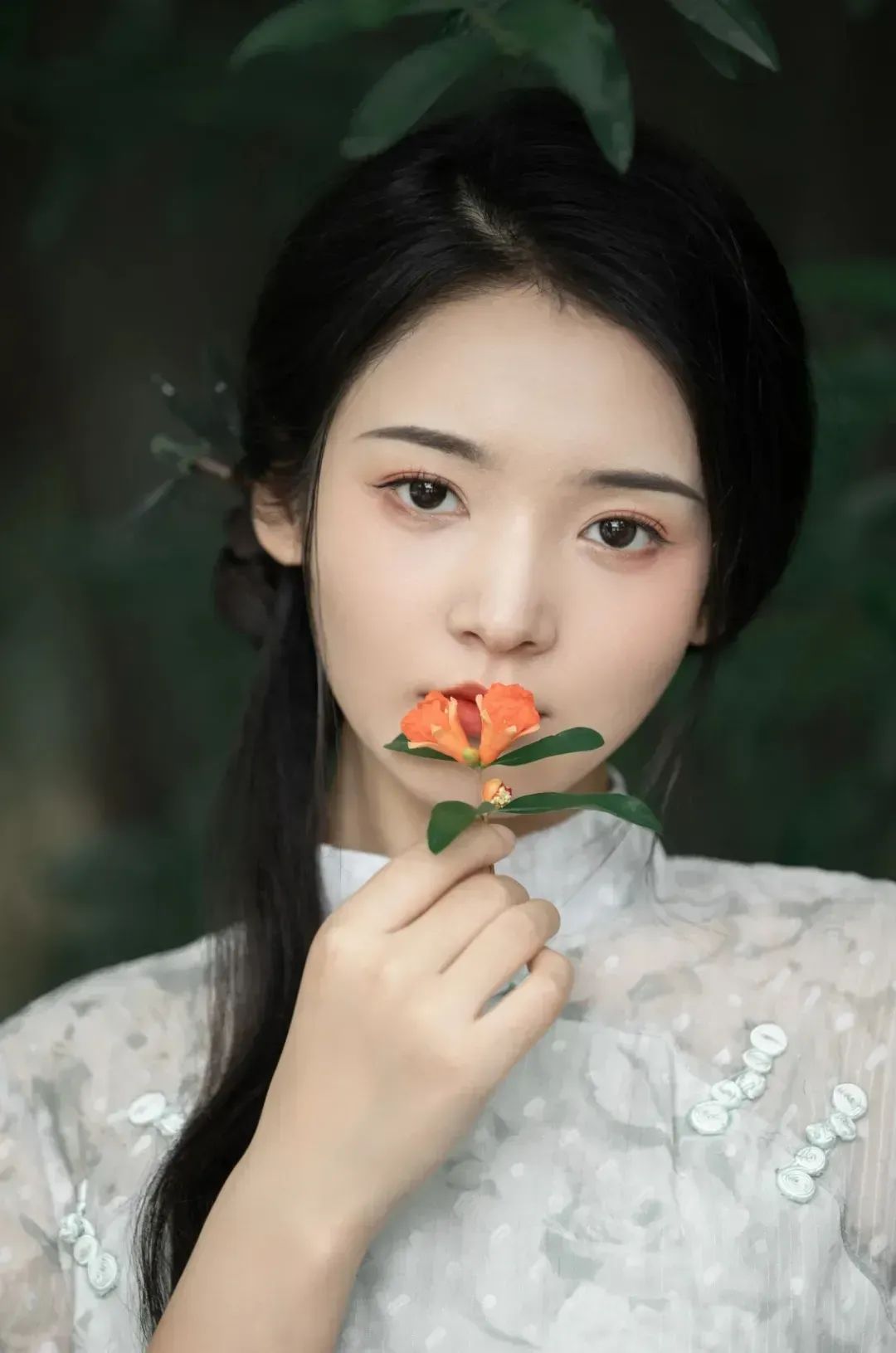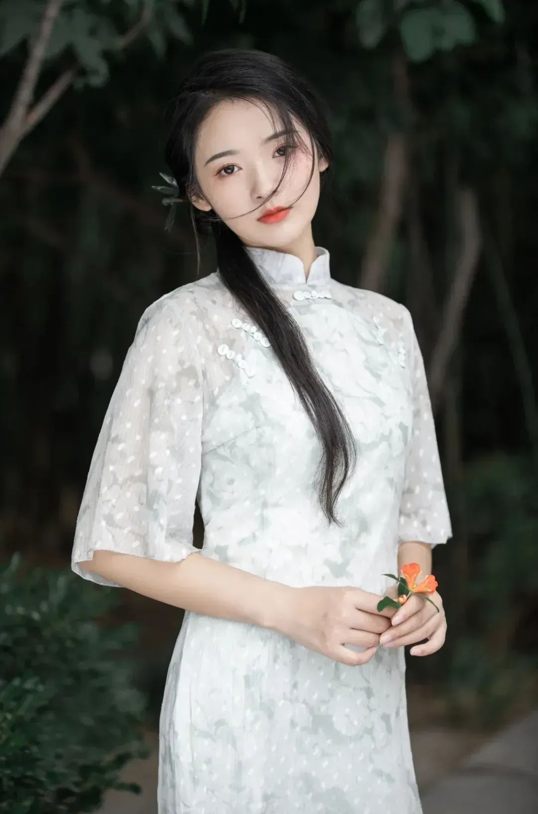 立于树下,发丝随风轻扬,手执小花,目光微扬,尽显清新脱俗之姿。微风拂面,每一帧都是自然的馈赠。