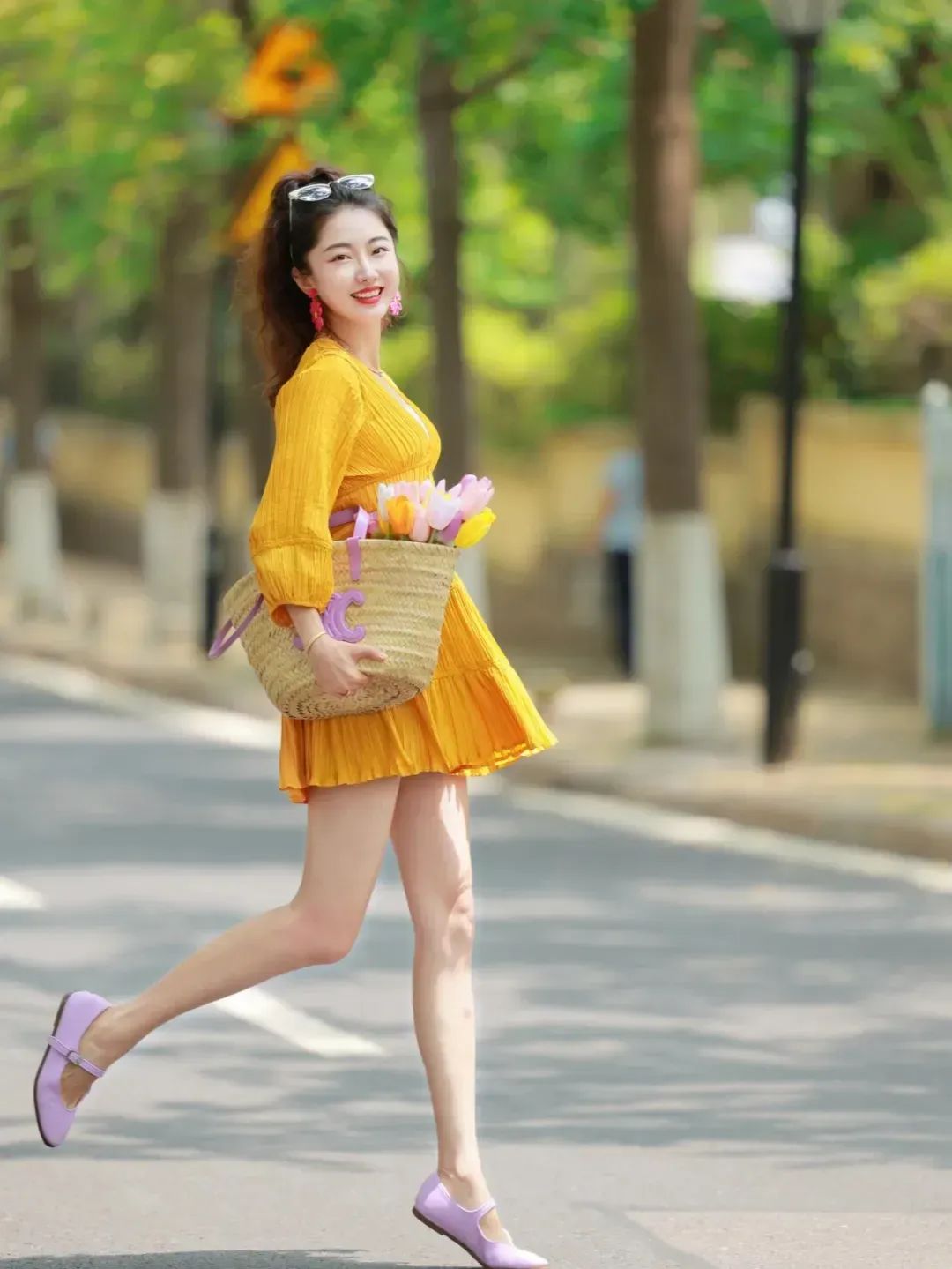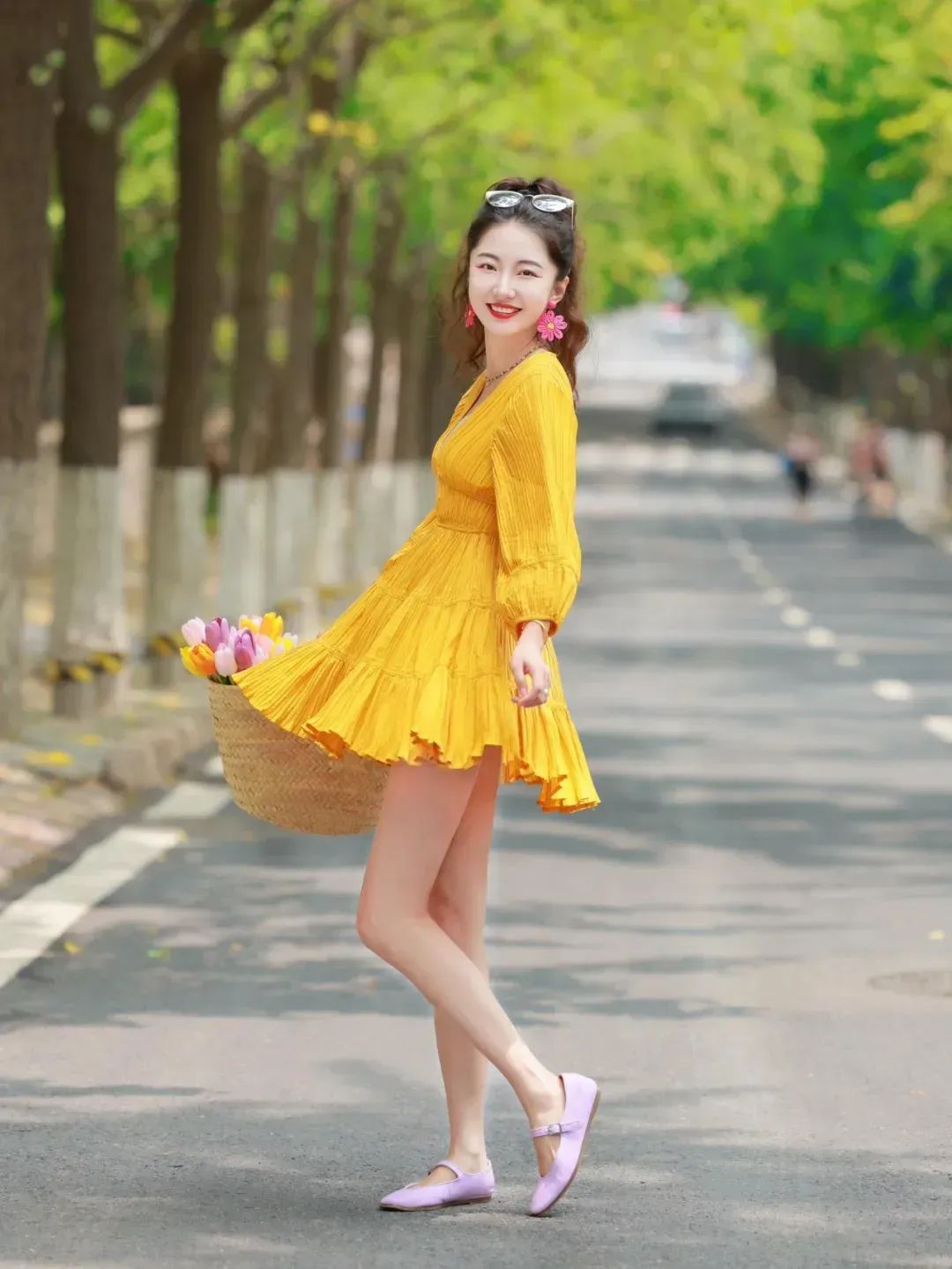 柔和阳光下,面对镜头轻轻旋转裙摆,手执花朵或小包,让裙摆与阳光共舞,交织出美丽光影。此动作赋予画面动感与活力,彰显你的自信光彩。