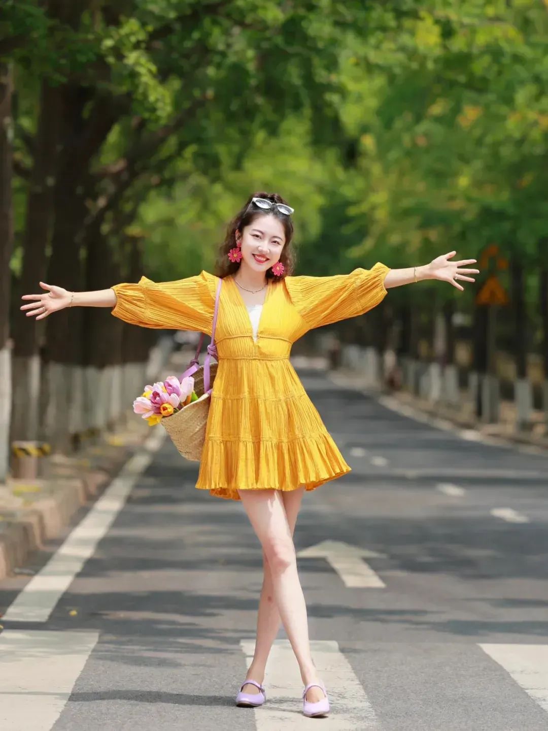 站于林荫道旁,双臂舒展,双腿优雅交叉,面带微笑,自然放松。此姿势不仅让你成为画面焦点,更让裙摆与周遭景致和谐相融,展现自信与开放之美。