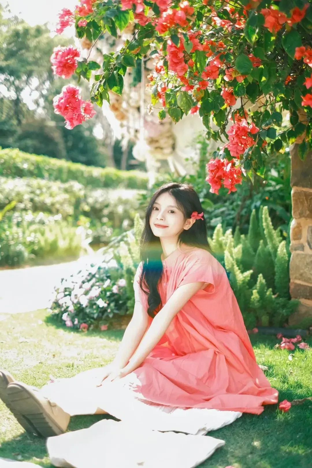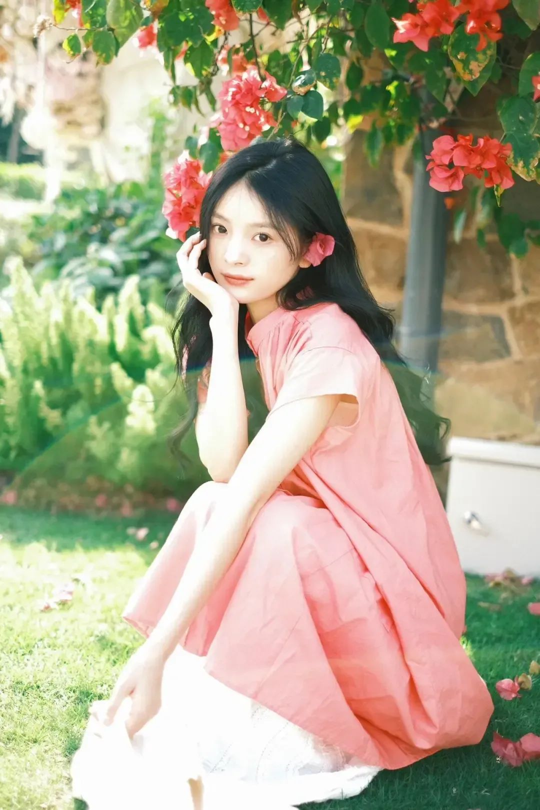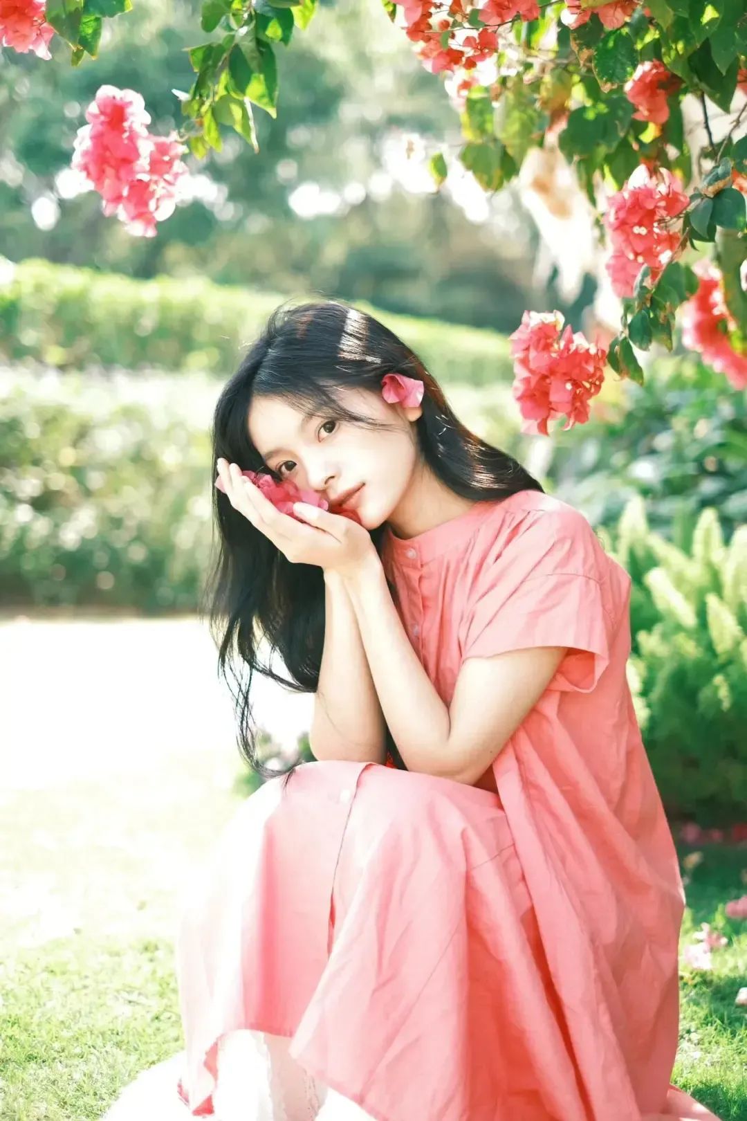 蹲在花枝下,低头轻托起一片花瓣,靠近脸颊。眼神清澈而自然,仿佛在与花儿低语。这个动作充满了少女的纯真与柔美,让整个画面显得和谐而宁静。