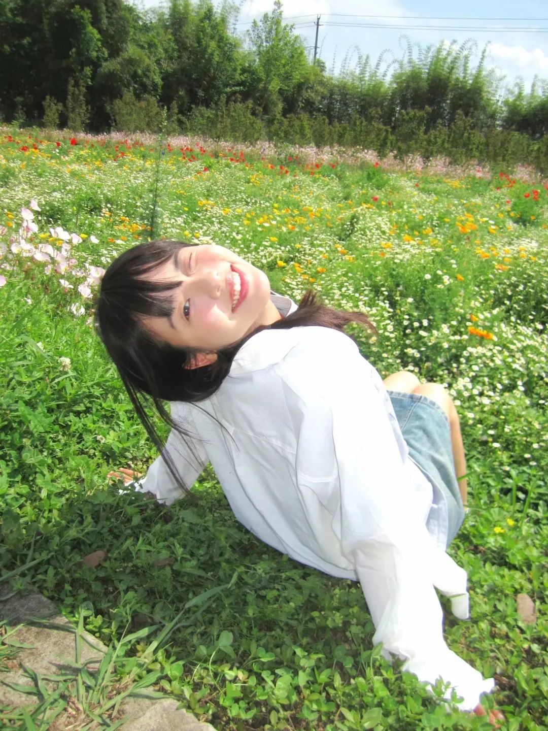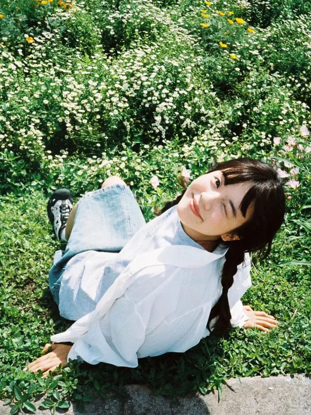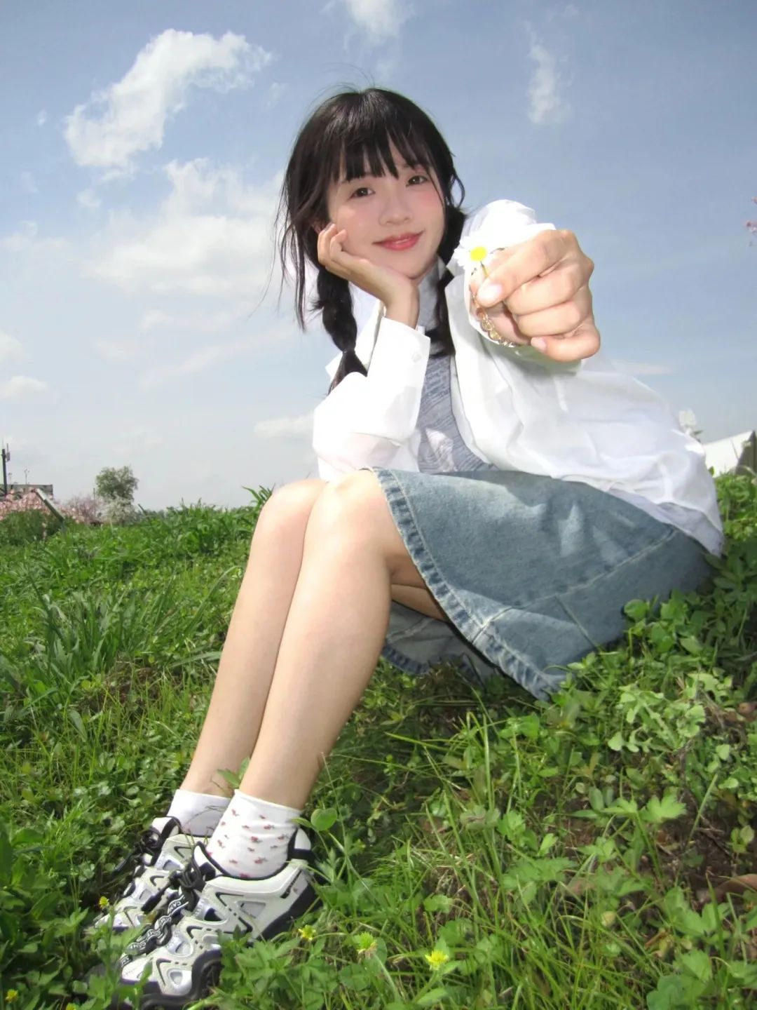 4、摄影师巧妙地选择低角度仰拍,营造出一种独特而引人入胜的视角。人像优雅地坐下,一只手轻托腮边,展现出悠闲而自在的神态。另一只手则轻轻摘下一朵野花,向镜头伸去,仿佛与观者进行一场亲密的互动。这样的拍摄方式不仅让人物形象更加立体生动,还赋予照片一种自然与野趣的交融之美,使画面充满了故事性和趣味性。