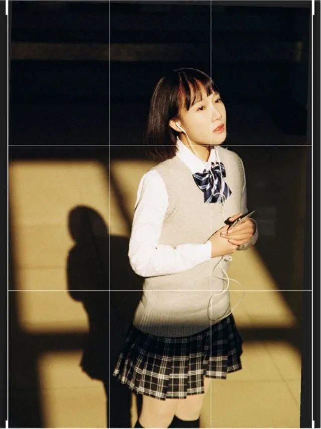 九宫格构图,实际上是“黄金分割”原理的简化版,又常被称作三分法构图。这种构图技巧在相机内置的参考线中常可见到,它可分为横向三分法和纵向三分法两种形式。在拍摄人像时,我们可以将画面横向或纵向平均分为三等分,并在这些分割线上巧妙地放置人物主体上。