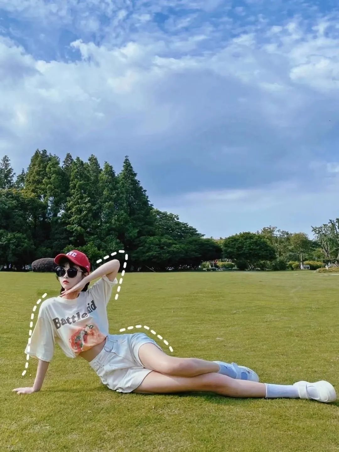4、当遇到如草坪这样的宜人场景时,不妨尝试躺坐下来,用手轻轻支撑着身体,同时将双腿伸直。这样的姿势不仅能够展现出轻松惬意的氛围,更能够在镜头中呈现出满屏的大长腿,增添无限魅力。