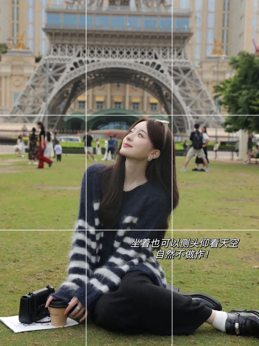 当模特抬头仰望时,肩颈线条得以自然拉伸,下颚线条也显得更加精致。你可以学习下面的模特,随性地坐下,侧头仰望天空。这样的姿势不仅能凸显出好看的五官轮廓,还能营造出一种松弛、慵懒的氛围,让照片更具自然美感和生活气息。