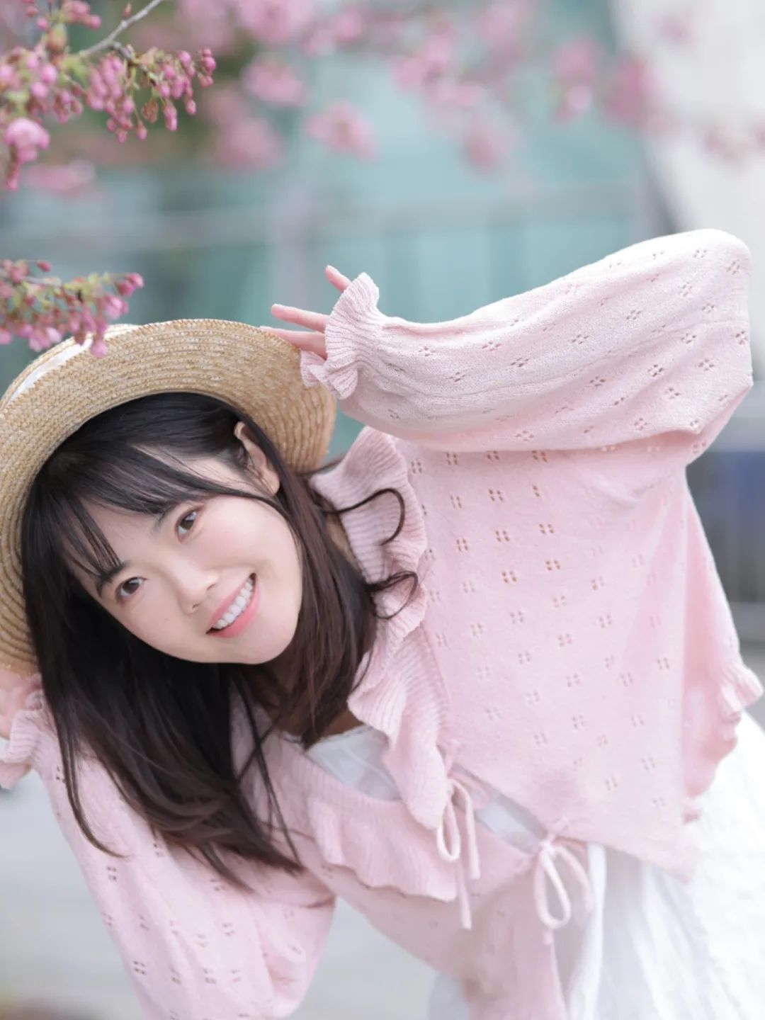 参考下图的模特:她弯腰从一侧探出身子,向镜头打招呼,这种姿势带有一丝鬼马精灵的俏皮感,让整张照片充满了活力与趣味。通过捕捉这些有趣的瞬间,我们能够更好地展现出春天的生机与活力。