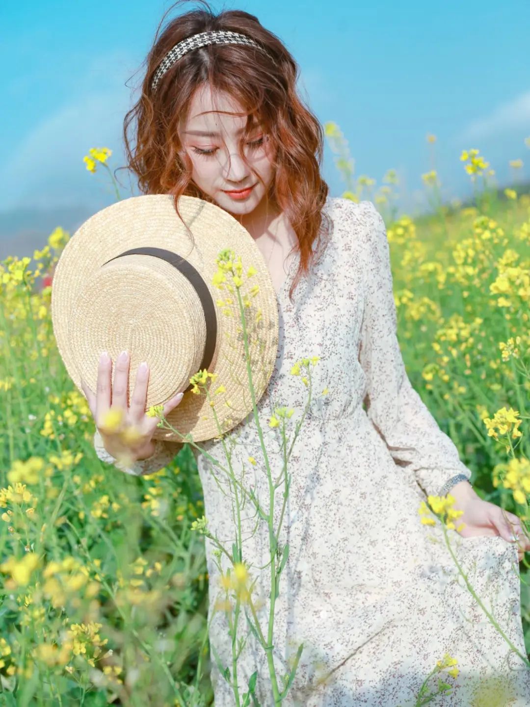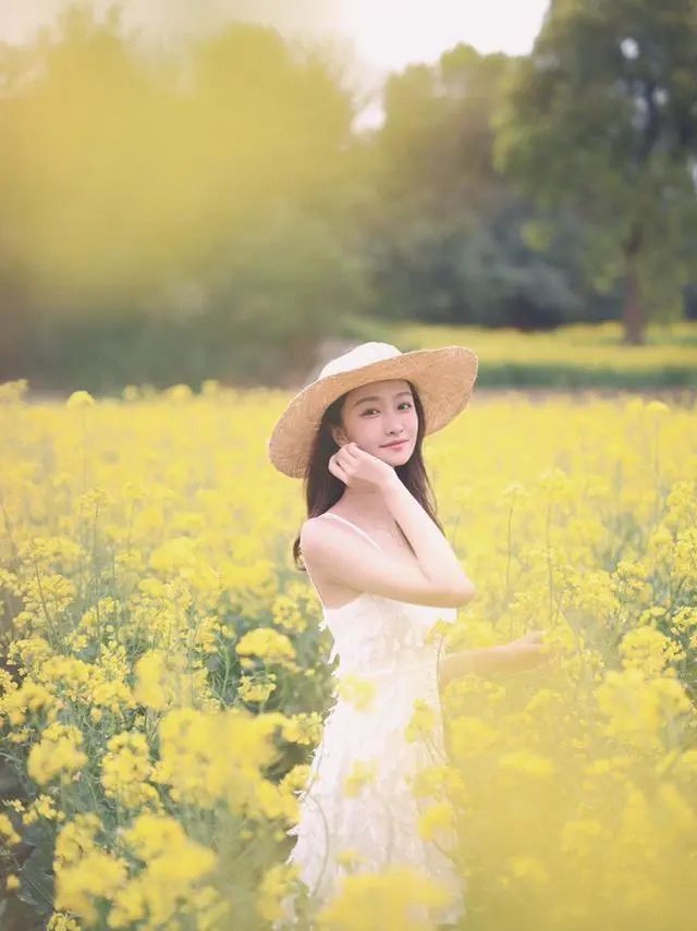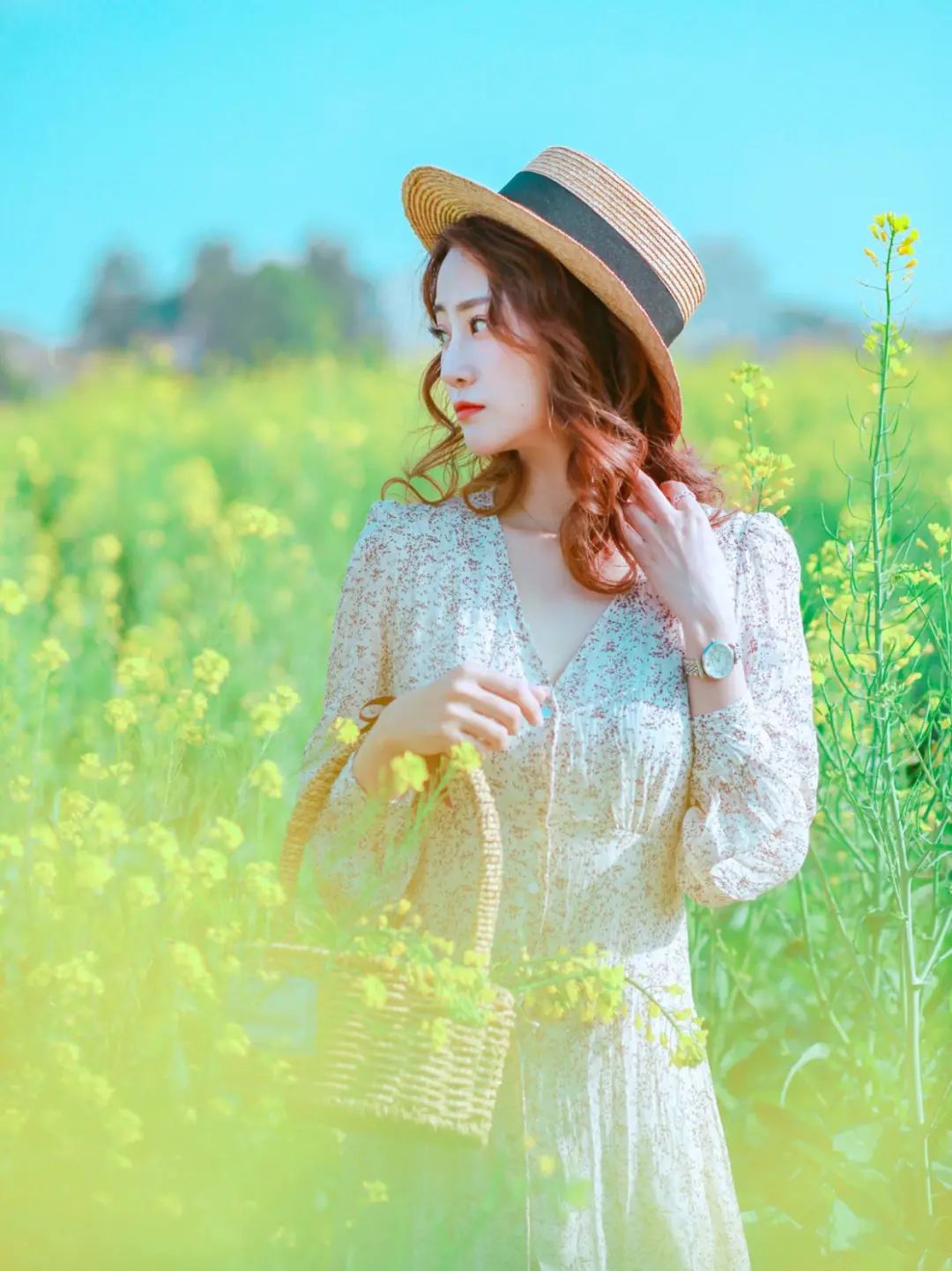 在拍摄油菜花照片时,你可以尝试一种更为自然的拍照方式。假装不知道镜头的存在,让自己沉浸在油菜花的海洋中,自然地低头走在花丛中。此时,你可以轻轻提着裙子或者优雅地拿着帽子,眼神专注地看着前方的路。通过这样的姿势,我们可以抓拍到一种特别自然且美丽的瞬间。