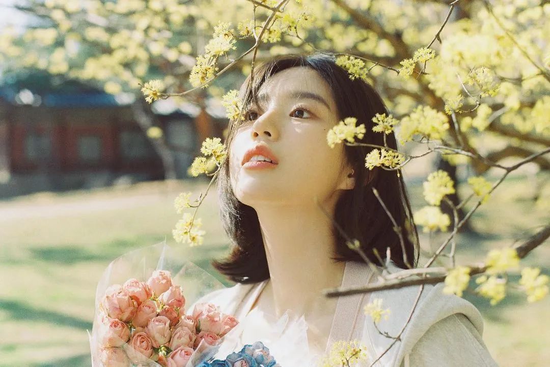 除了自带的一些互动道具,也可以选择一枝开得灿烂的花枝作为互动的道具。不断变换角度和构图,就能拍出一组花间美照了。