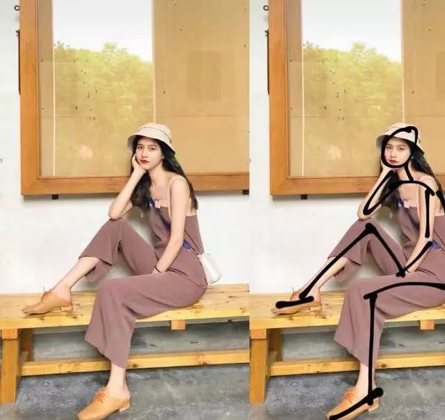 5、一种坐姿,很好学!适合拍一-些街头风酷酷风的感觉。就是坐在正常高度的长椅上,可以把脚放.上去,微屈,稍微微驼背一点,然后托腮,很酷酷很性冷淡风。