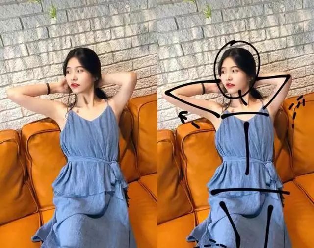 7、坐姿小窍门,要尽量延展身体!可以让摄影师站着拍,然后人身要往后靠,手可以枕在后面,总之就是尽量伸展自己的身体,这样比较不会显得整体比例不正常。