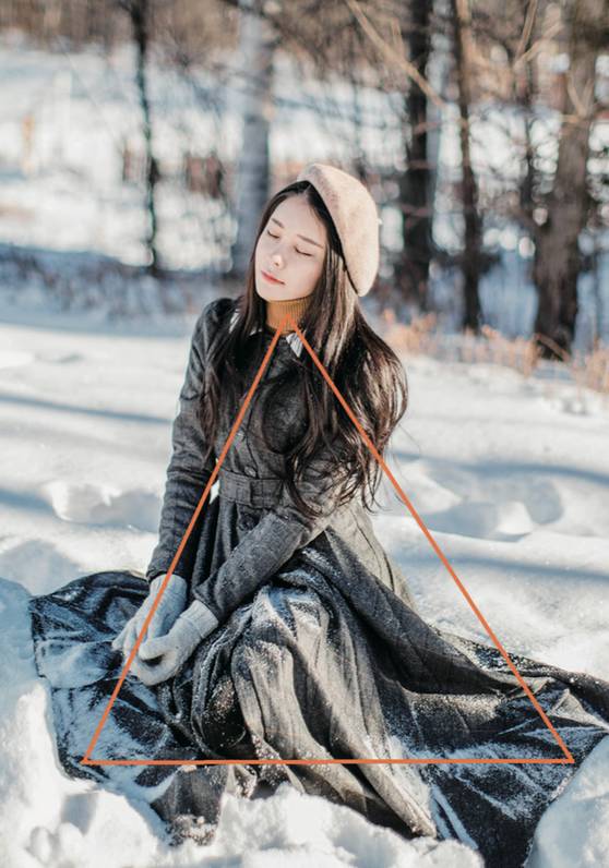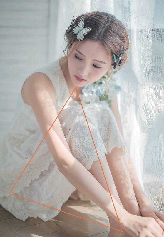在人像摄影的构图中使用三角形构图,也会来带画面的稳定、和谐感。三角形构图在拍摄人物坐姿的时候运用较多,头、手、脚(或膝、臀)成三角形分布,可以让姿态更自然。