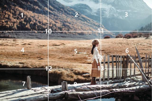 常用的构图方法,可以让画面的主体沿着其中任意一条横线或竖线延伸,也可以将主体放置于10~13这4个点的任意一个上。这样可以避免单一中心点构图方式使画面呆板,在拍摄人物与环境相结合的画面时,可以很好地运用这种构图。九宫格构图也适合小广角和中长焦镜头。