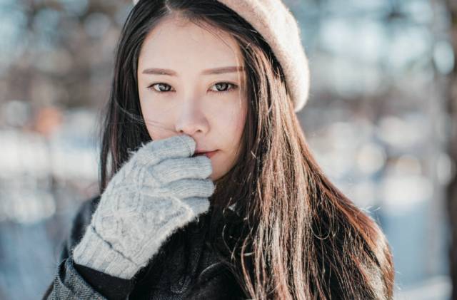 上午10点左右,雪地中的拍摄。当时光线明亮,地面的大片白雪又形成了巨大的反光板,女孩的眼神光非常明亮,为了突出眼神,采用了出血构图