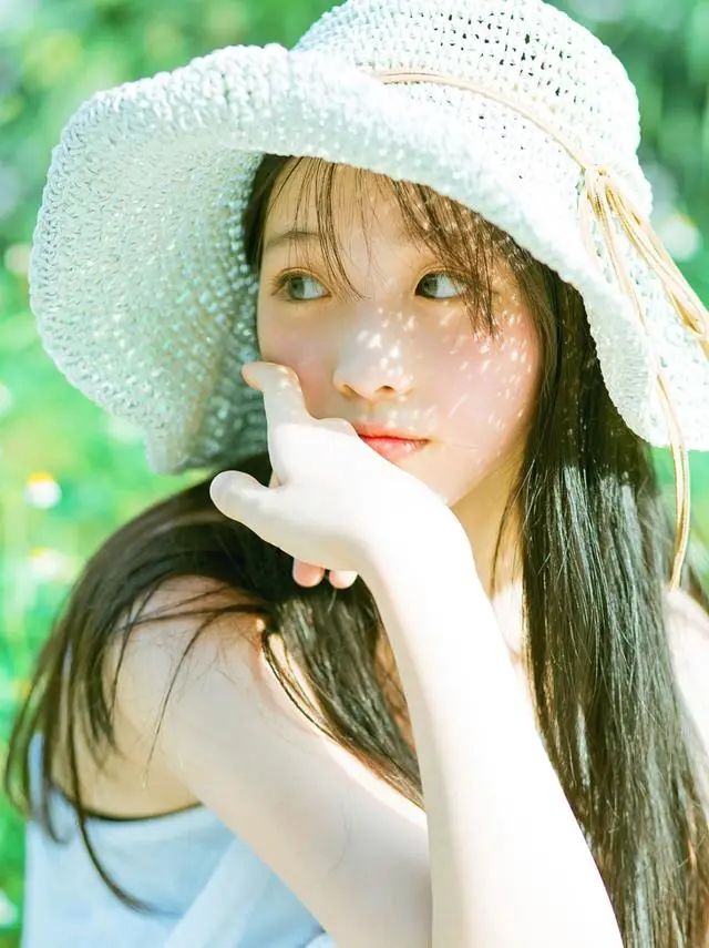 女生侧身坐在镜头前,靠近镜头的一只手胳膊弯曲手放在耳朵后面,另一只手自然垂下,戴上一顶镂空的这样搞,阳光穿过这种孔洞后会留下光影,印在脸上显得整张照片显得暖洋洋的,其他场景则可以借助一些绿植营造光影。