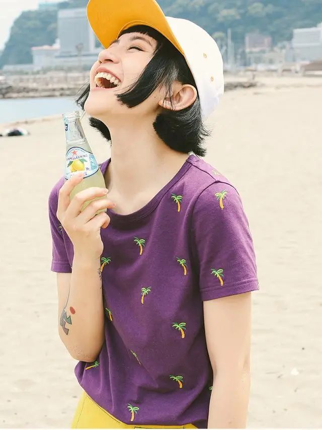 女生在沙滩上,晴朗的天气非常适合我们拍照,女生侧立站在镜头前,离镜头最近的一只手自然垂下,另一只手拿着一些沙滩上卖的饮品当道具,胳膊肘弯曲手拿饮料放在下巴下,女生抬起头大笑,给人很愉快的感觉,戴上一顶鸭舌帽来做装饰,也起到了遮阳的效果,摄像师找好角度拍下就可以用了哦。