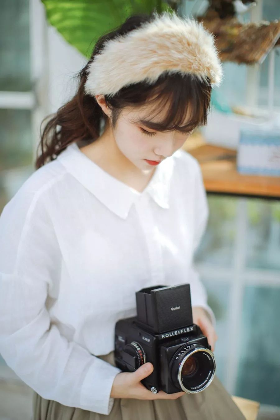 寻找光线多次反射后的方向,巧妙的利用阴影和受光面的关系,还可以让妹子的脸显得更小。模特也要进行一定的摆姿配合,让脸部朝向反射最强的白墙和天花板,微微仰首,脸部充分受光,五官非常立体,同时让脖子和脸庞过渡处产生过渡的阴影,可以看起来显得脸庞更小,实际上这是光线的魔法。