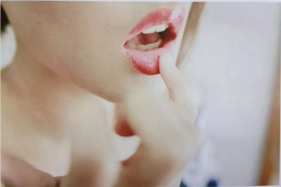 模特用手涂抹口红,画面的焦点在模特的嘴唇处。相对于图2,因为裁掉了嘴巴以上的脸部,反而会使画面有更多想象的空间。