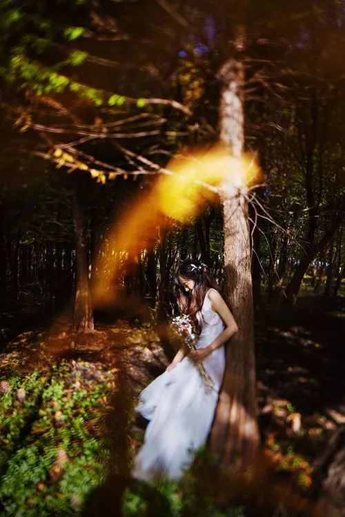 一束明媚的光透过树的缝隙照射下来,人的位置刚好处在光里,强烈的光影对比突显了人物。利用被光照亮的枝条作为前景,增加画面的唯美、梦幻感。我常常被某种独特的形式、线条或是点线面之间的结构关系所打动,利用其作为前景会令画面形成别具一格的趣味之美。