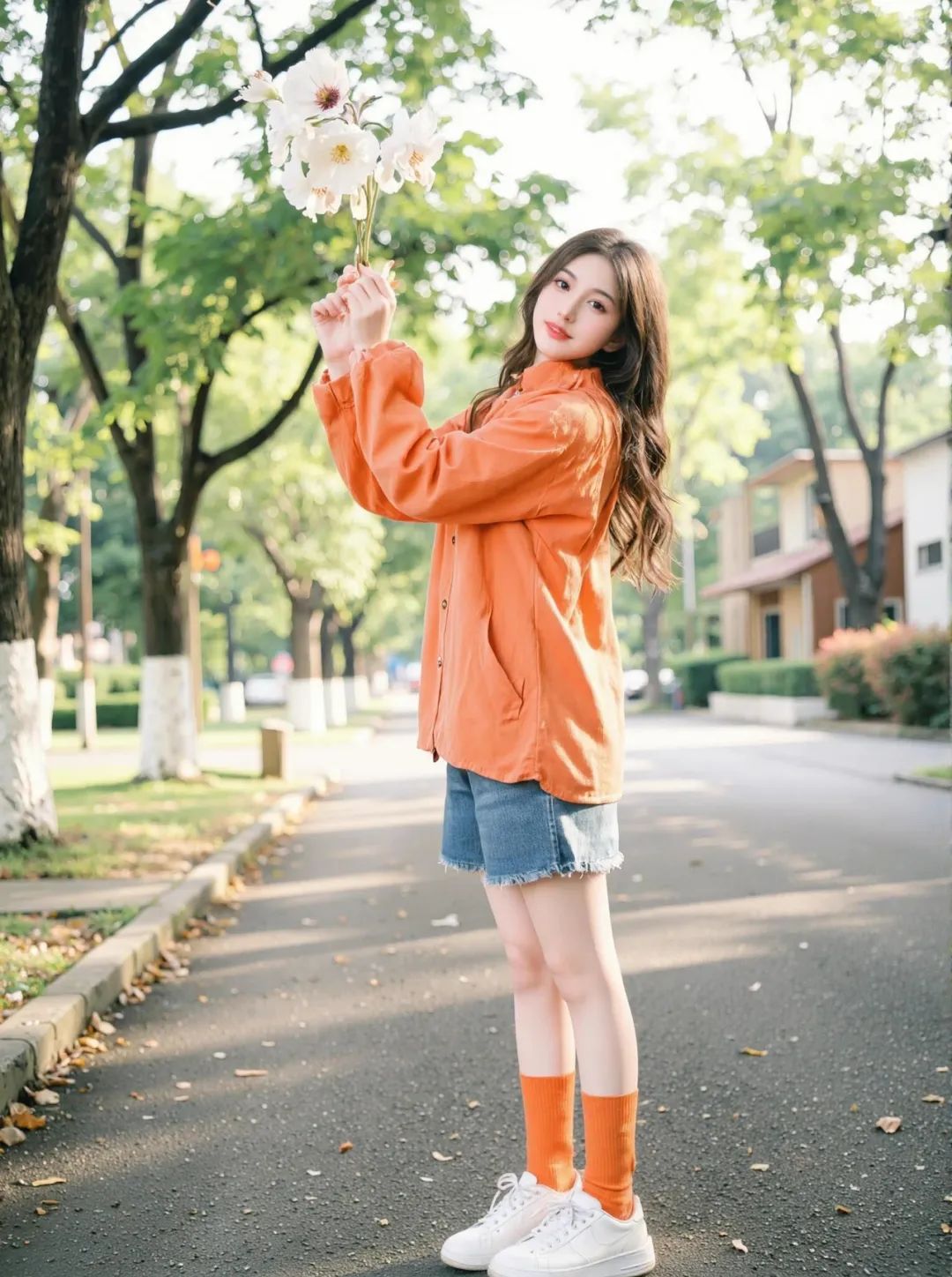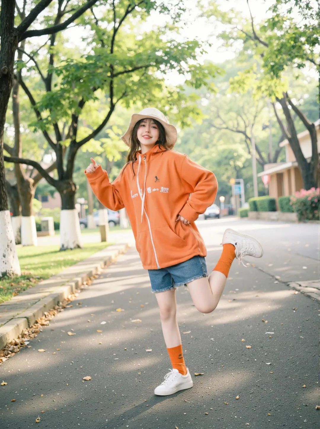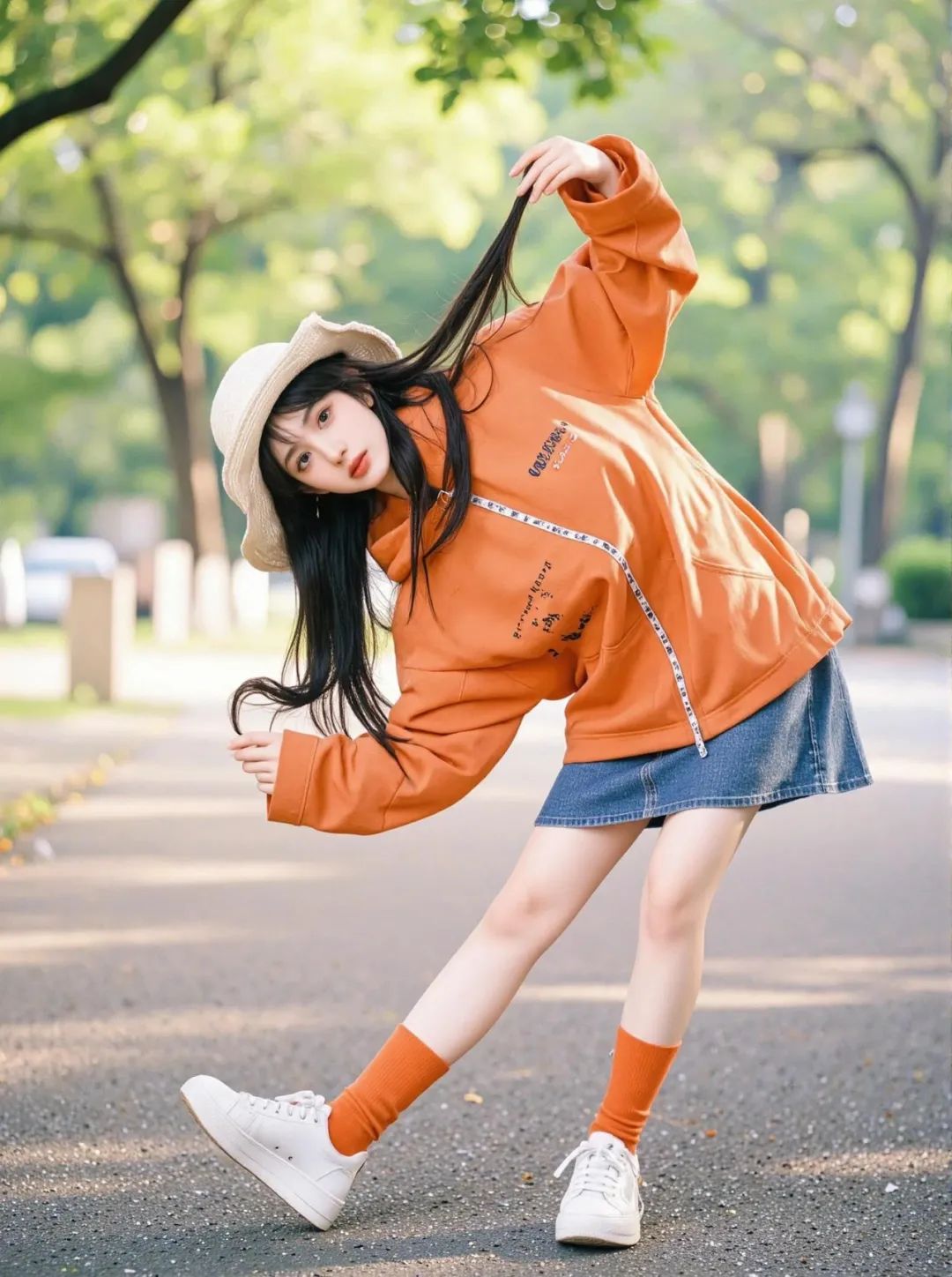 身体倾斜,一手高高抓起头发,一手自然伸展,大幅度的甩发动作,让发丝飞扬充满动感。这样的姿势搭配橙色穿搭活力满满,与户外的自然环境相得益彰,展现出青春的朝气与灵动,瞬间打破拍照的呆板感。