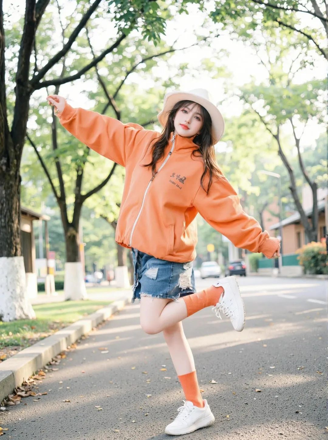 一条腿稳稳站立,另一条腿俏皮翘起,一手叉腰,另一手竖起大拇指,这样的姿势俏皮又自信,展现出一种随性的魅力。户外的环境为画面增添了自然的底色,使人物更加突出。
