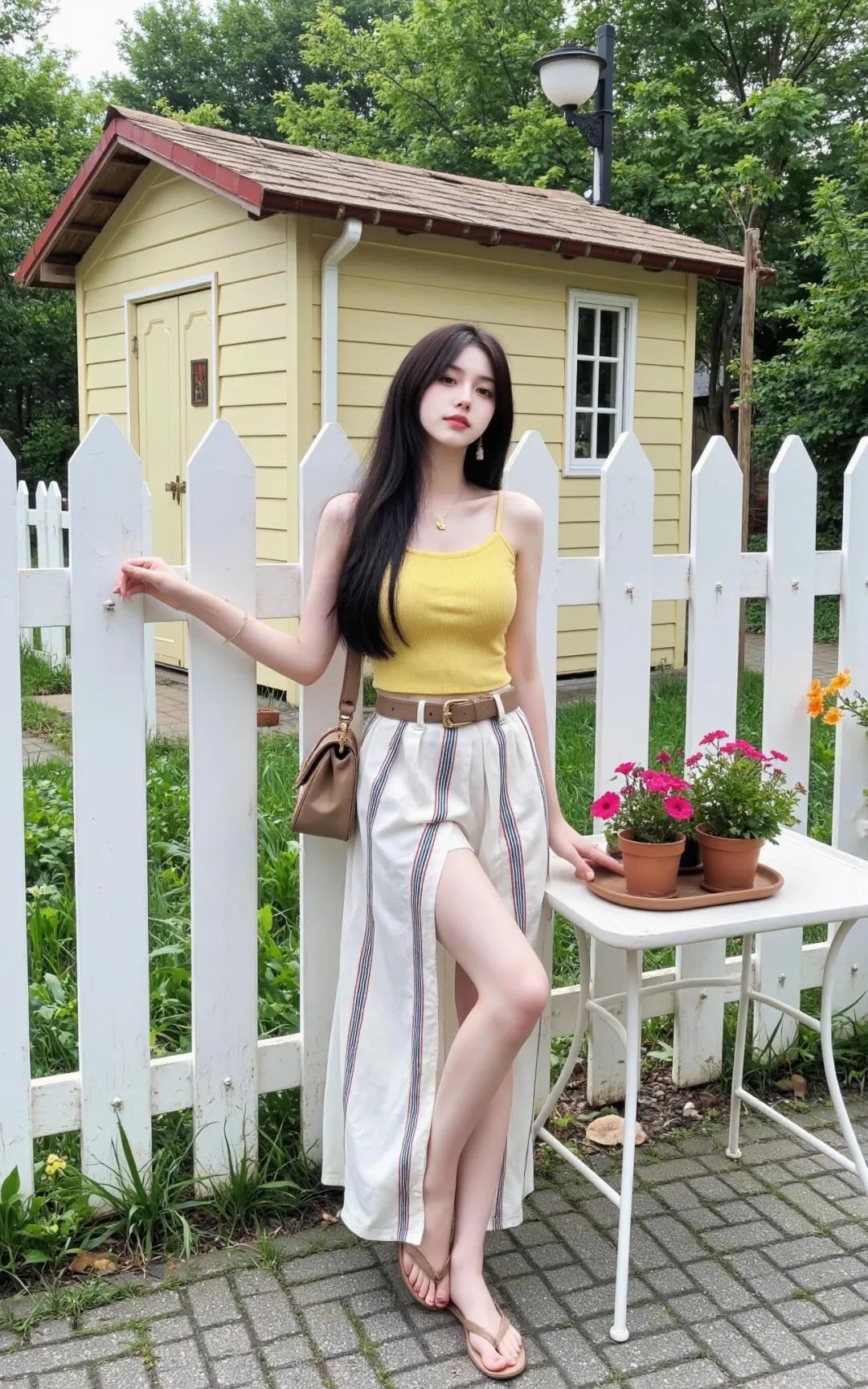 背靠白色栅栏,单手轻拎棕色包包,另一手垂放身侧。背靠栅栏的动作,给人放松、无拘无束的感觉。微微扭转的身体,增加了画面的立体感与动态感。这样拍出来的照片营造出自然又时尚的氛围。